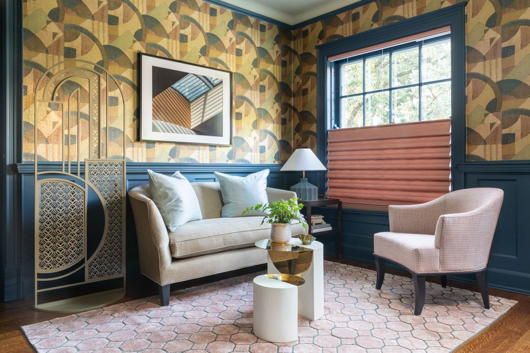 This cozy sitting room plays with Art Deco curves, geometric patterns and saturated tones for a look that feels both retro and refreshingly current. Photo by Anna Spaller