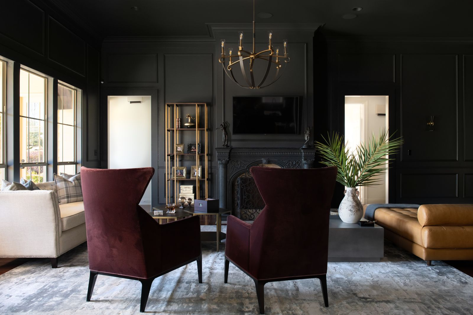 A pair of burgundy velvet wingback chairs face a carved black fireplace, echoing the room’s dark paneling. Photo by Haylei Smith