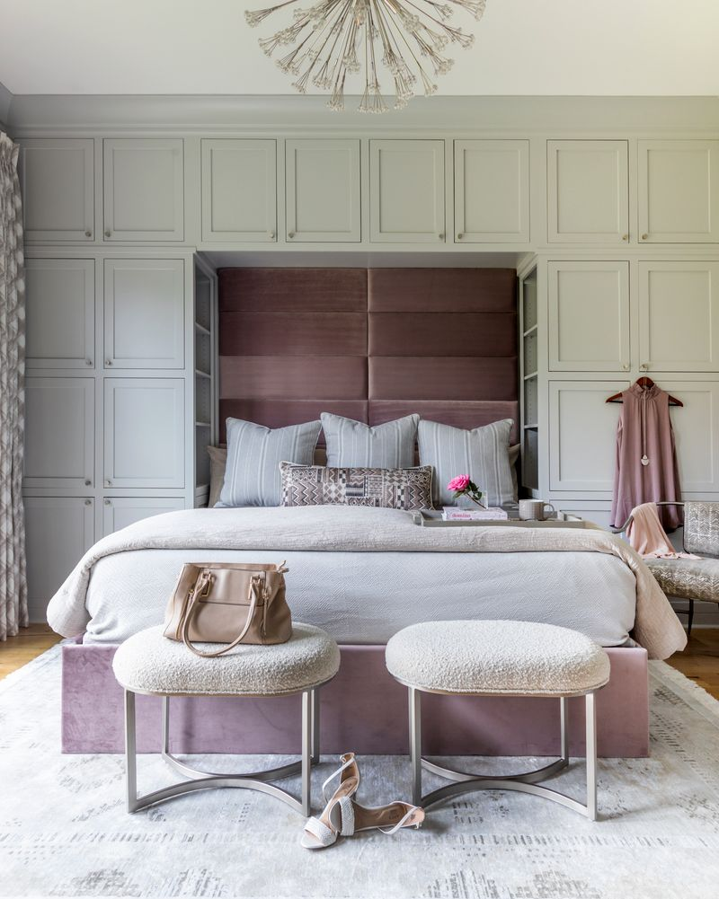 Soft mauve velvet grounds this bed, while boucle stools, built-in cabinetry and tailored textiles layer in polish and practicality for a look that balances femininity with function. Photo by Jessie Preza