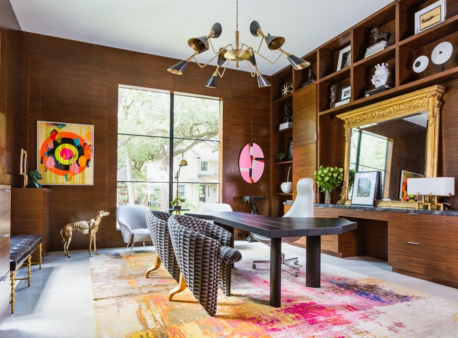 Vivid colors sit against the rich wood tones surrounding this office and show off the owner’s personality.