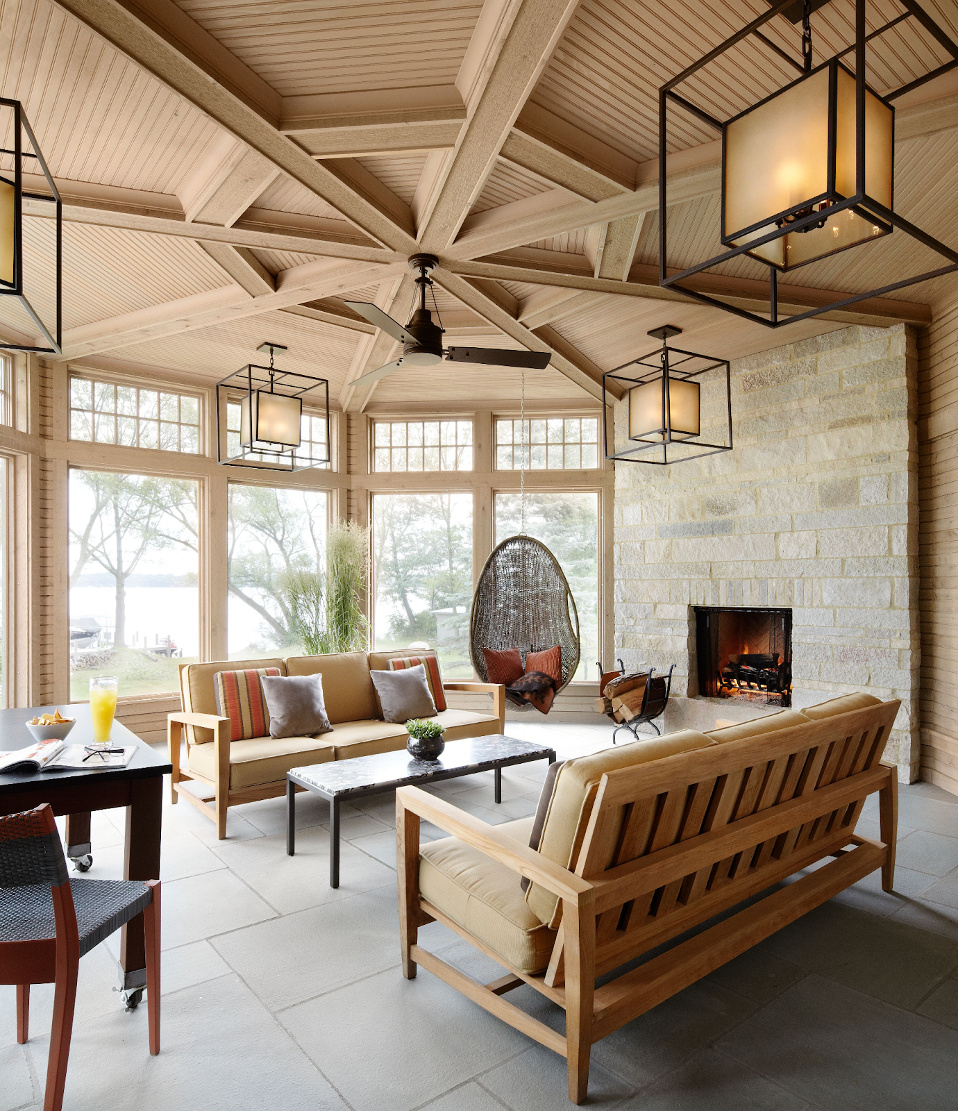This inviting getaway porch features a beautifully crafted wood-beamed ceiling, expansive lake views, and a cozy fireplace creating a seamless indoor-outdoor retreat.