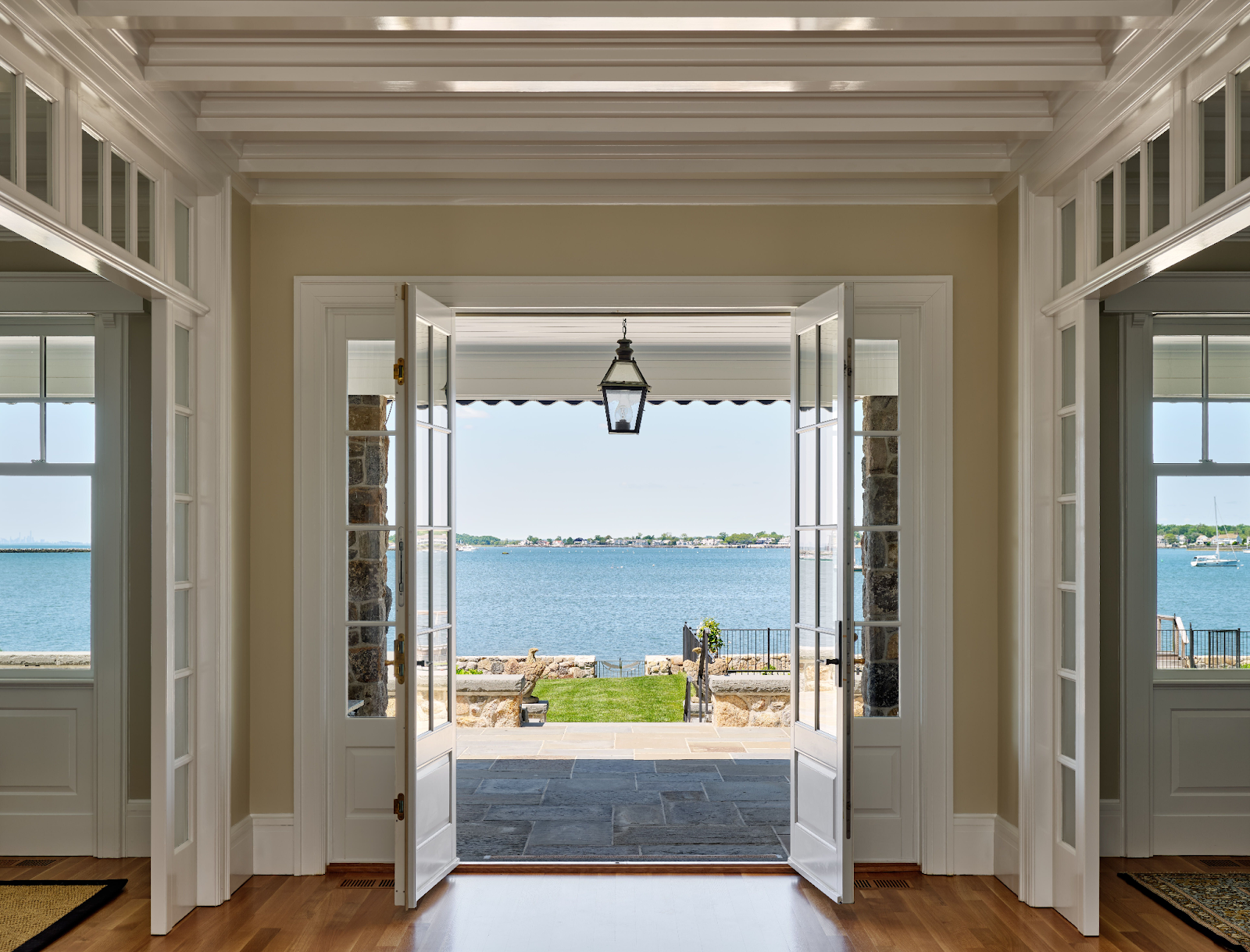 Framed by elegant millwork and expansive glass doors, this entryway seamlessly extends into a breathtaking waterfront view, blurring the line between indoors and out.