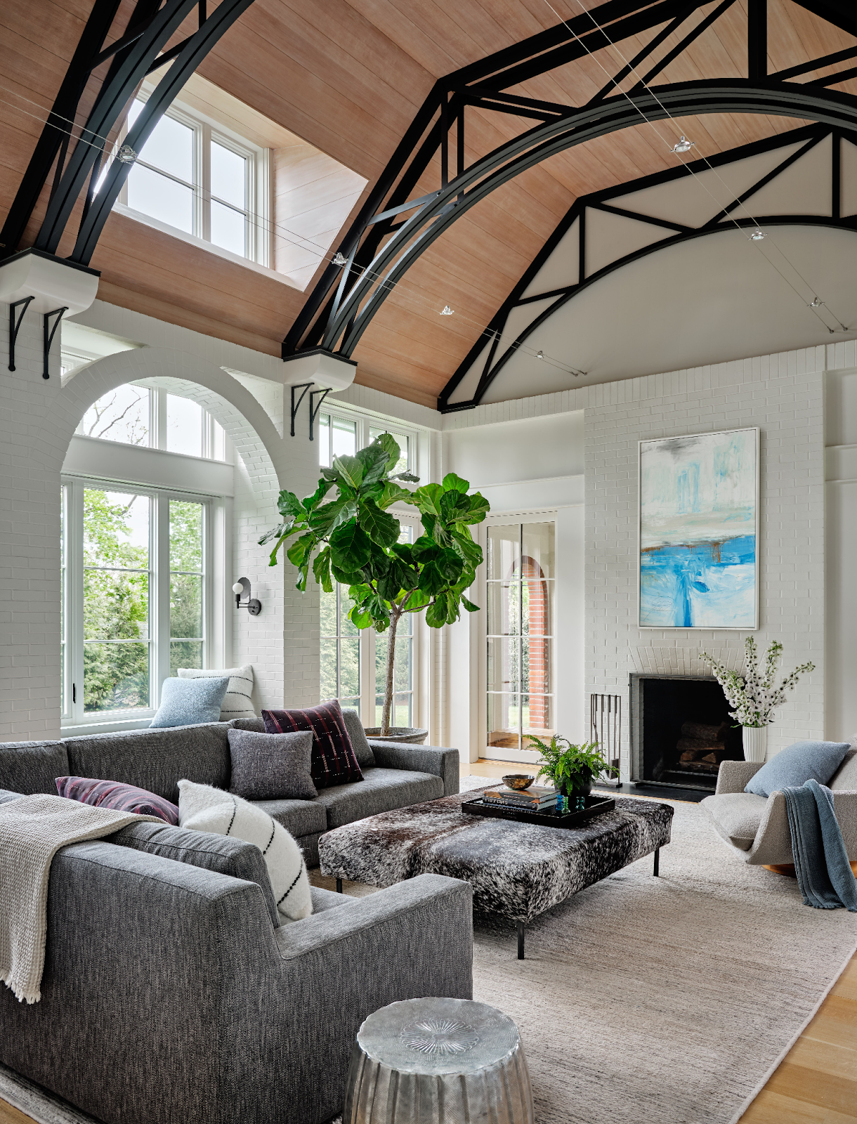 Soaring steel trusses, warm wood ceilings, and arched windows define this striking yet inviting living space.