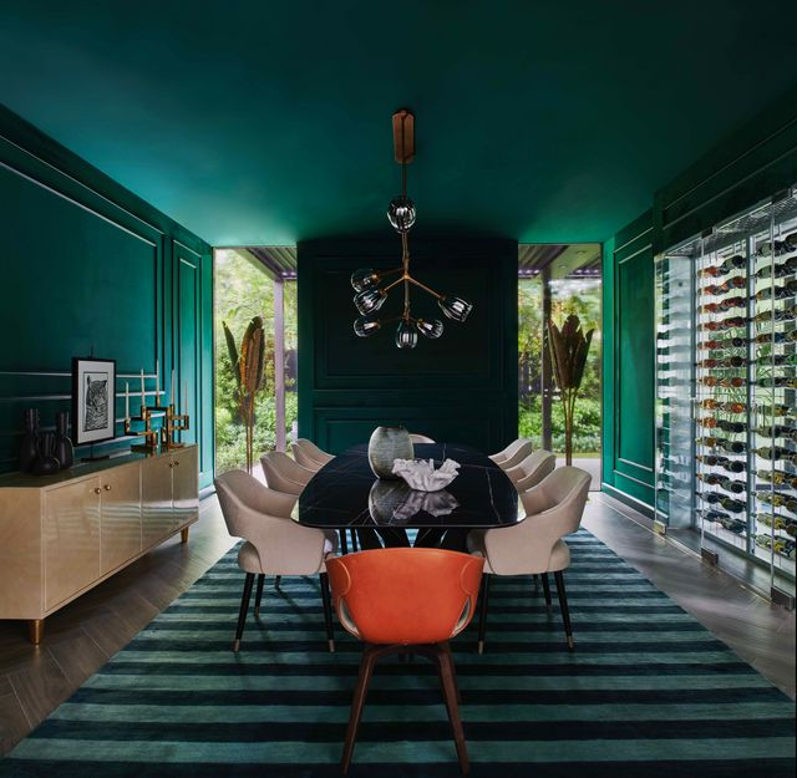 On the other side of the wine cellar, the aforementioned dining room features malachite green suede that’s perfectly accented by The Rug Company’s striped wool and silk rug for an opulent touch.