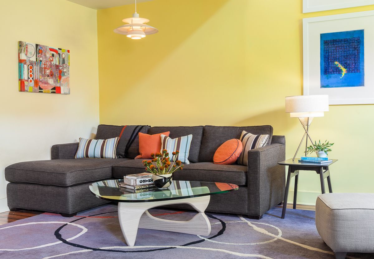 This living room seamlessly blends airy elements, featuring light yellow walls, a sleek glass table and minimalist art.