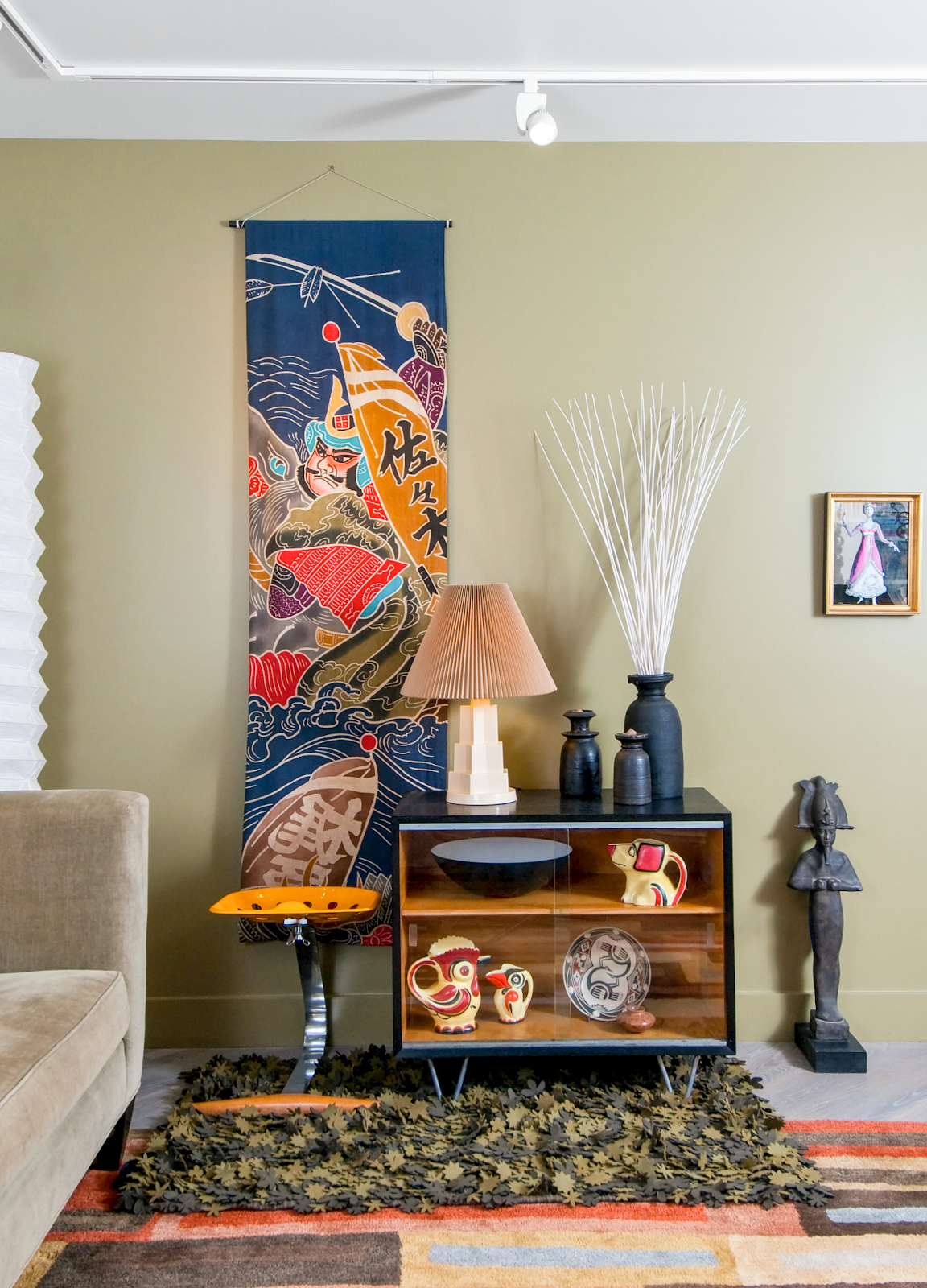 A curio cabinet presents Erphila pitchers, complemented by Casas Grandes pottery on top, and is finished with a classic 1950s Japanese batik banner draped above.