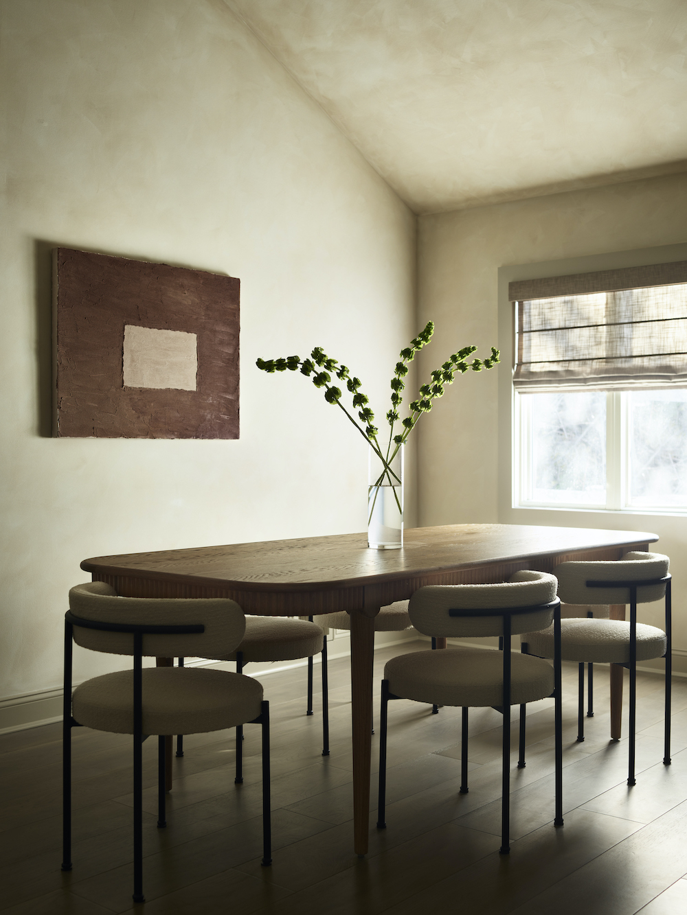 Elisa Baran’s weathered Tuscan aesthetic provides both texture and old world charm. The antique plastered walls warm this minimalist kitchen, while jet black saddle stools offer needed contrast to the room.