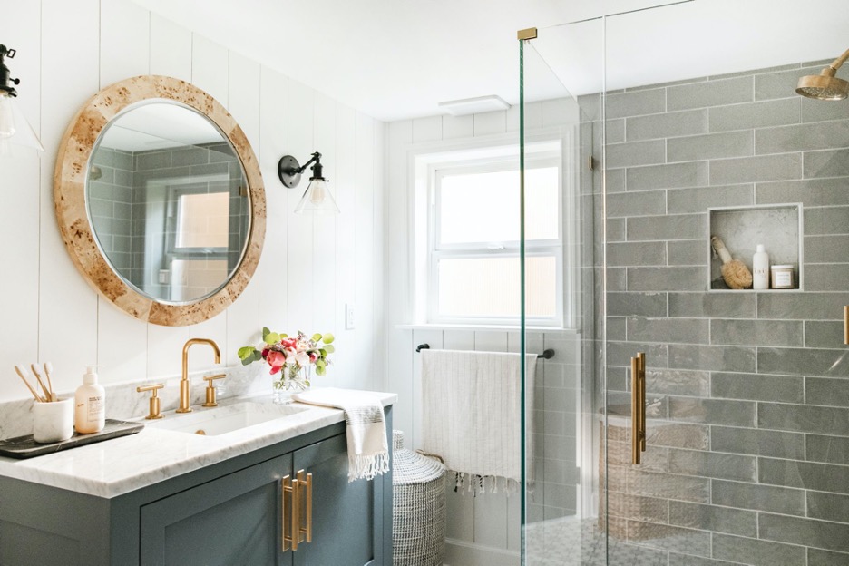 White shiplap walls and white marble countertop contrast with the gray stone shower and deep green-gray paint for the cabinetry. The cork-style mirror plays with the brass hardware and elevates this serene bathroom space.