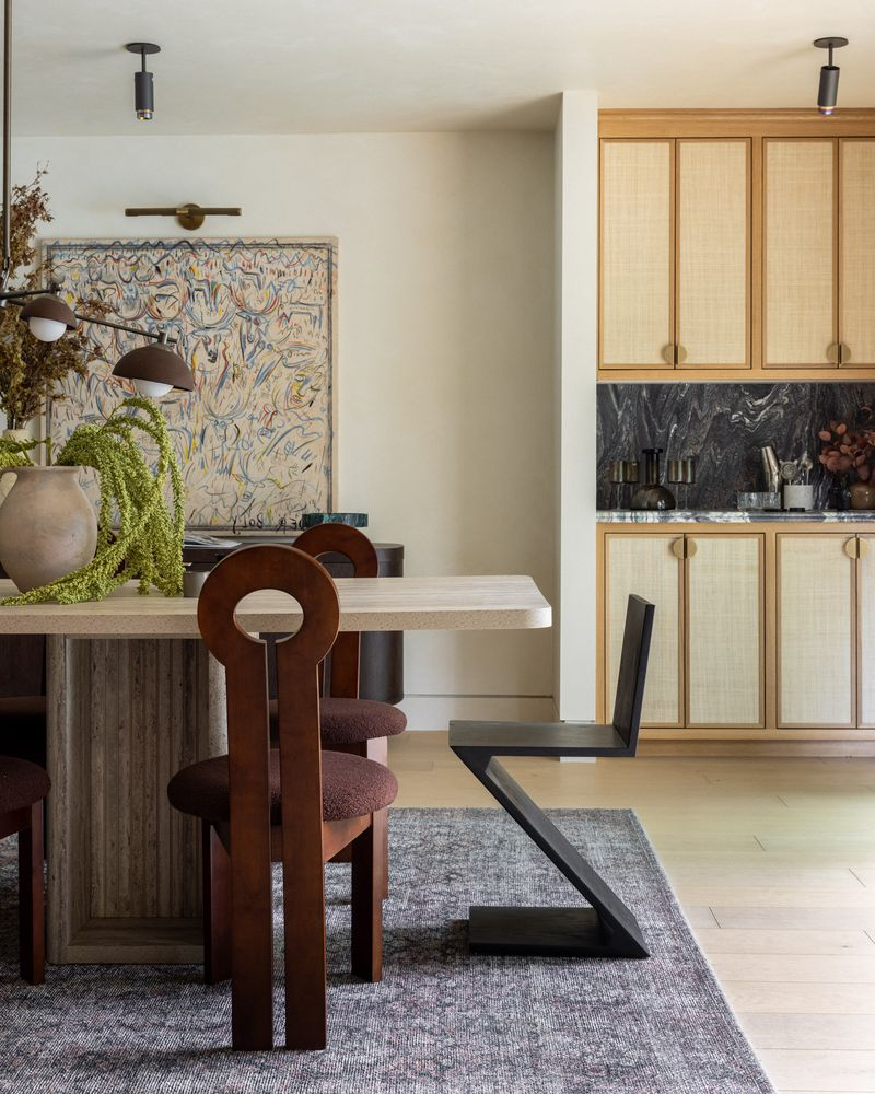 A collector’s dream, this space blurs the line between dining and gallery with statement chairs that double as art and a backdrop that speaks to a deep appreciation for expressive form.