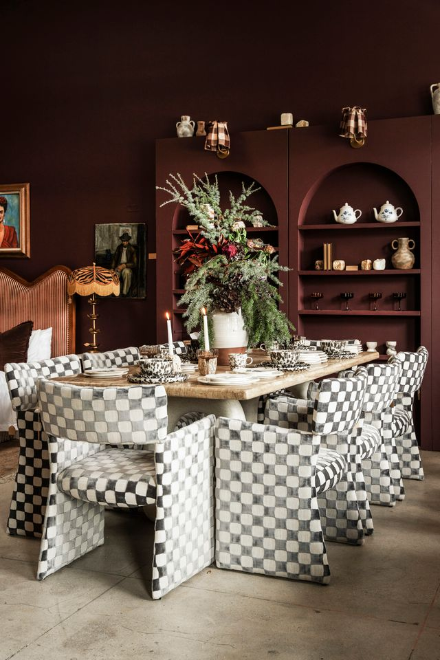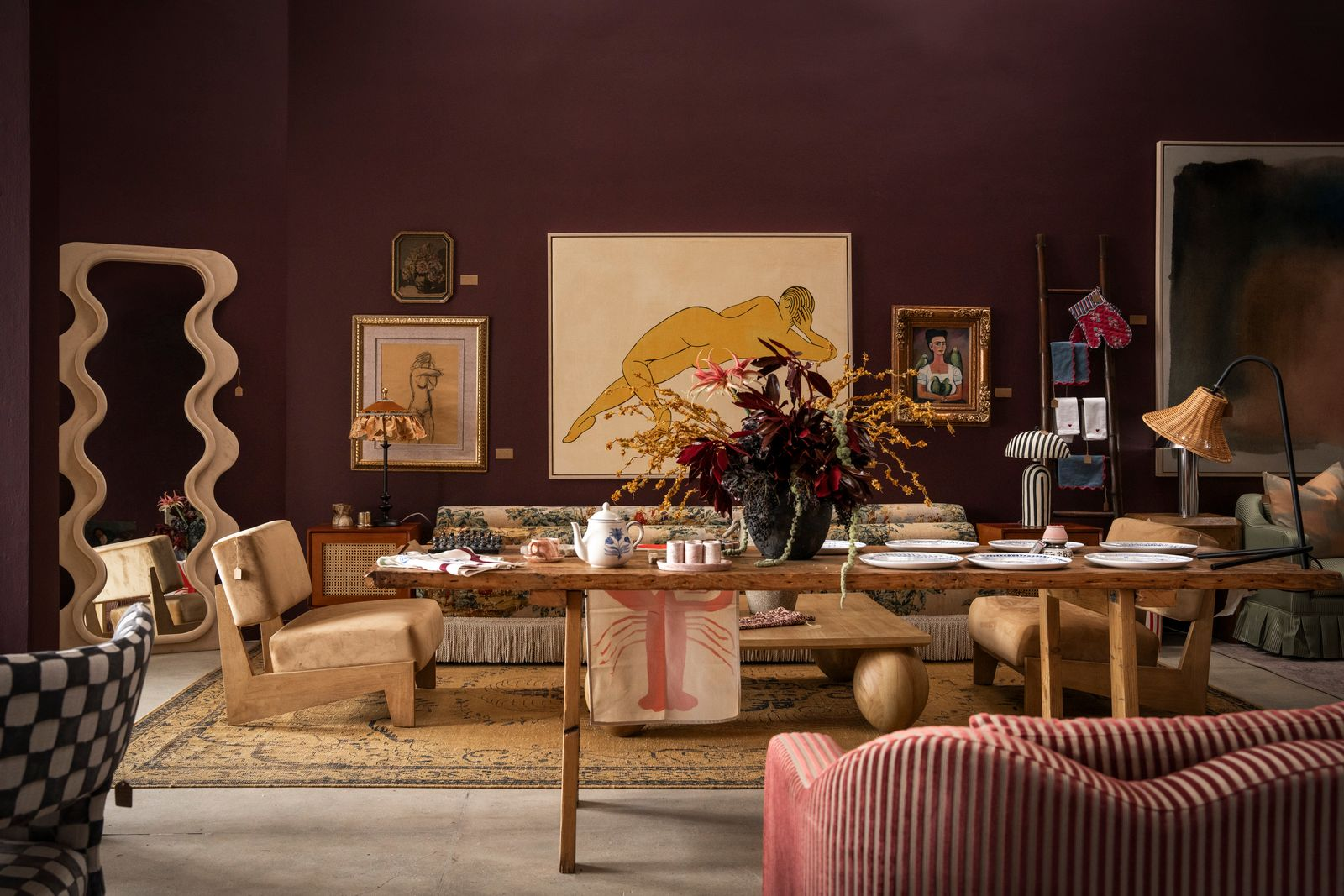 A masterclass in tonal layering and pattern play, this dining room pairs sculptural seating with saturated walls and a commanding floral moment.