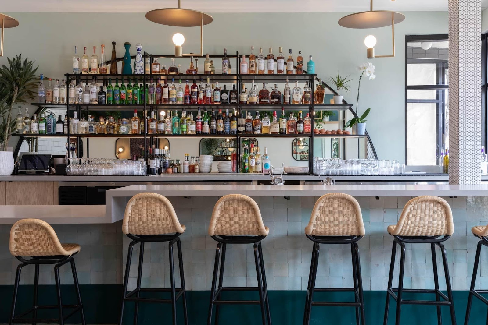 At Jo’s Modern Thai, Hannah Collins kept elements of the owners Thai heritage with various methods, one of them being the Rattan bar stools placed against the zellige tiled bar kick.