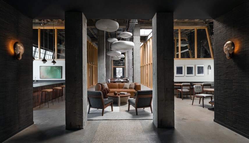 This Portland Penthouse is not your typical office space. Concrete pillars and textured walls make for a moody feel, but the angled walls, Alaskan yellow cedar, and central open space gives a sense of drama to the room.