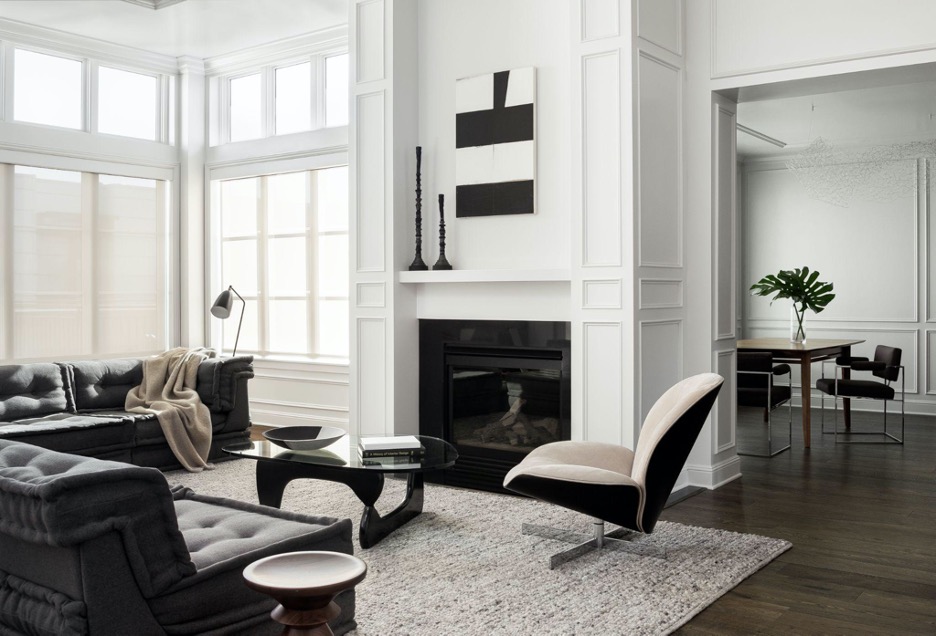 A sharp contrast is created in this living space with dark wooden flooring next to white walls, while textural furniture and rugs lend the space a more soft, organic feel. A Mahjong Roche Bobois sofa set in charcoal is truly luxury comfort seating around an original Noguchi coffee table.