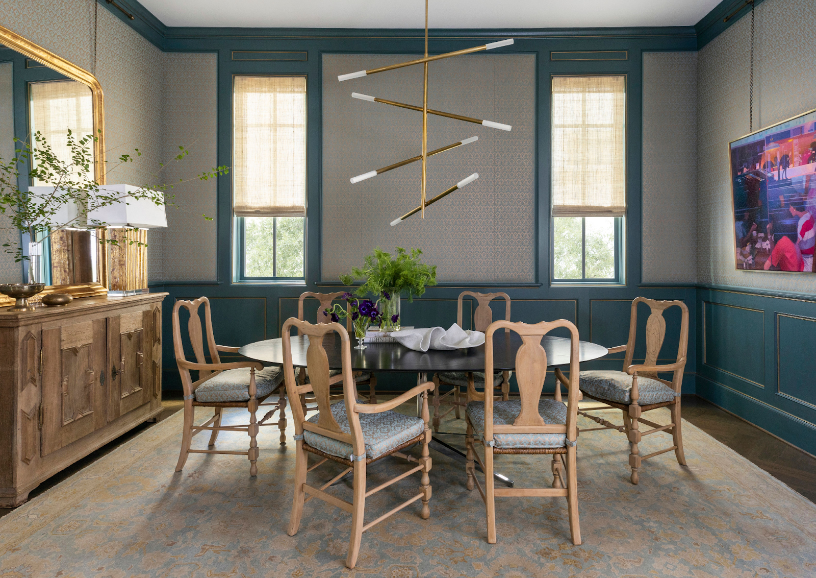 This dining room exudes elegance with its bold teal paneling, french provincial chairs, and beautifully crafted Matt Camron rug that anchors the space and ties all the elements together seamlessly.