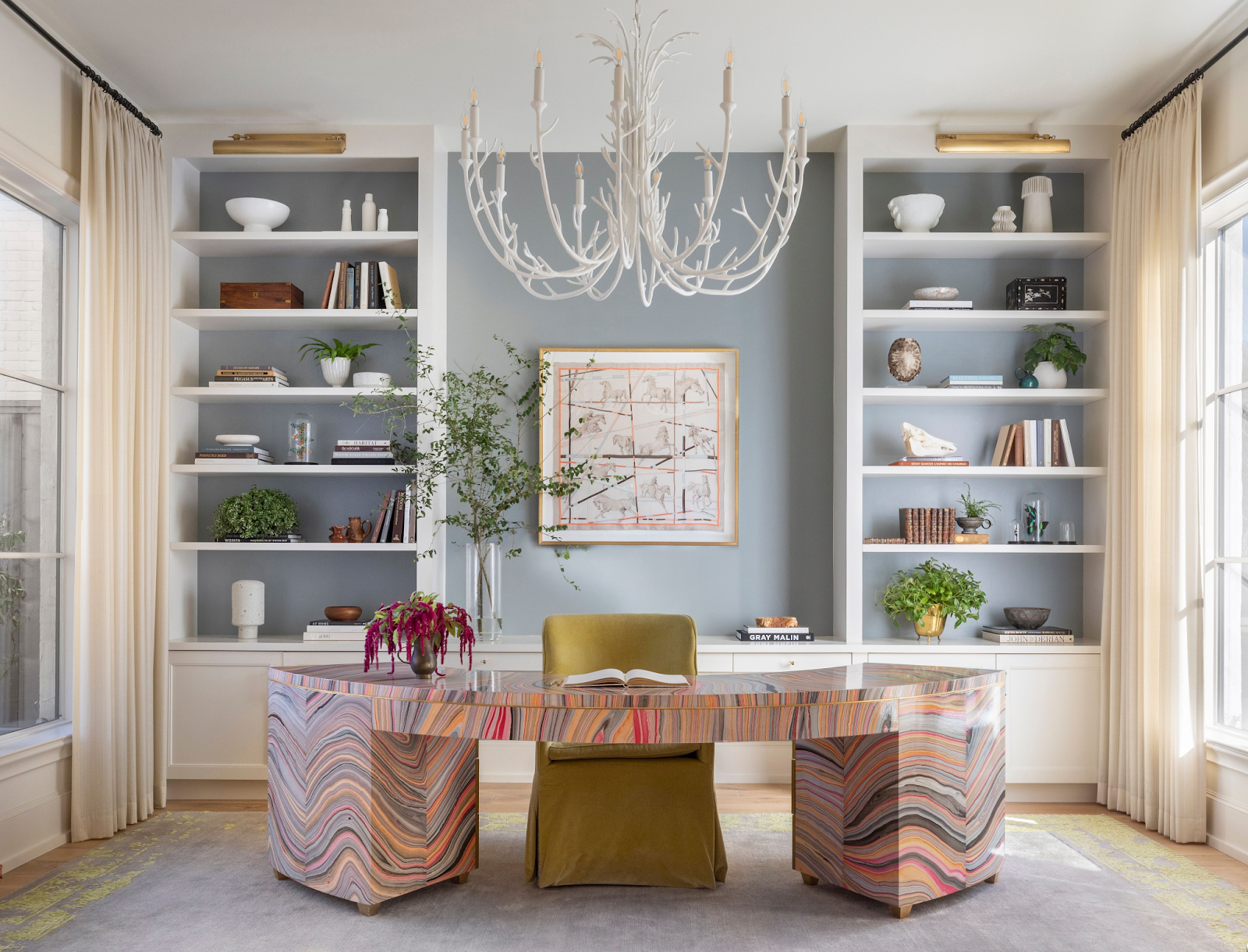 This chic home office pairs a statement marbled desk with soft blue walls and built-in shelving, while the elegant antler chandelier from Visual Comfort adds a touch of whimsical sophistication.