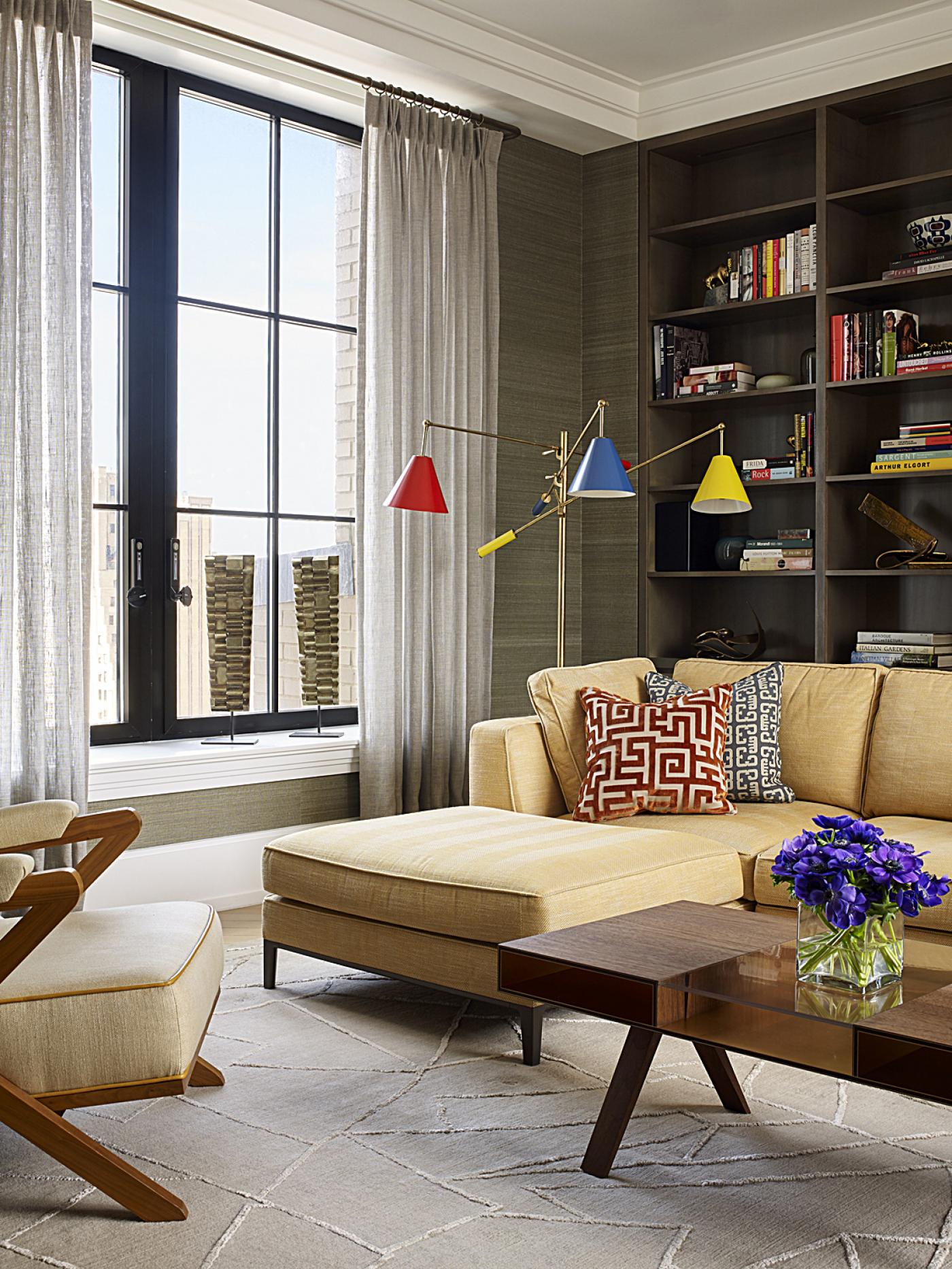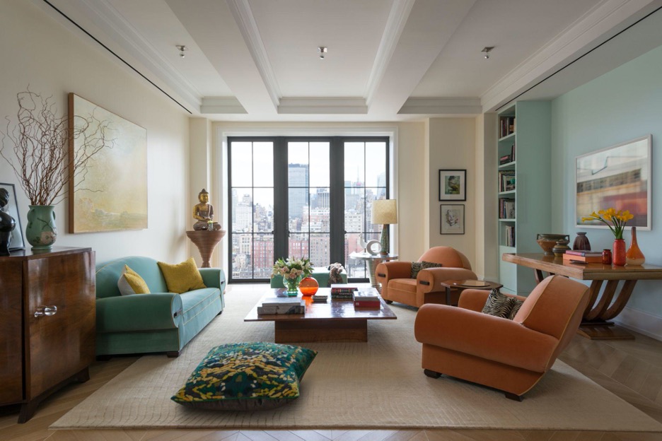 In this New York City living room, shades of soft celadon green and vibrant tangerine are thoughtfully dispersed creating a sophisticated and spirited ambiance in the heart of the city.