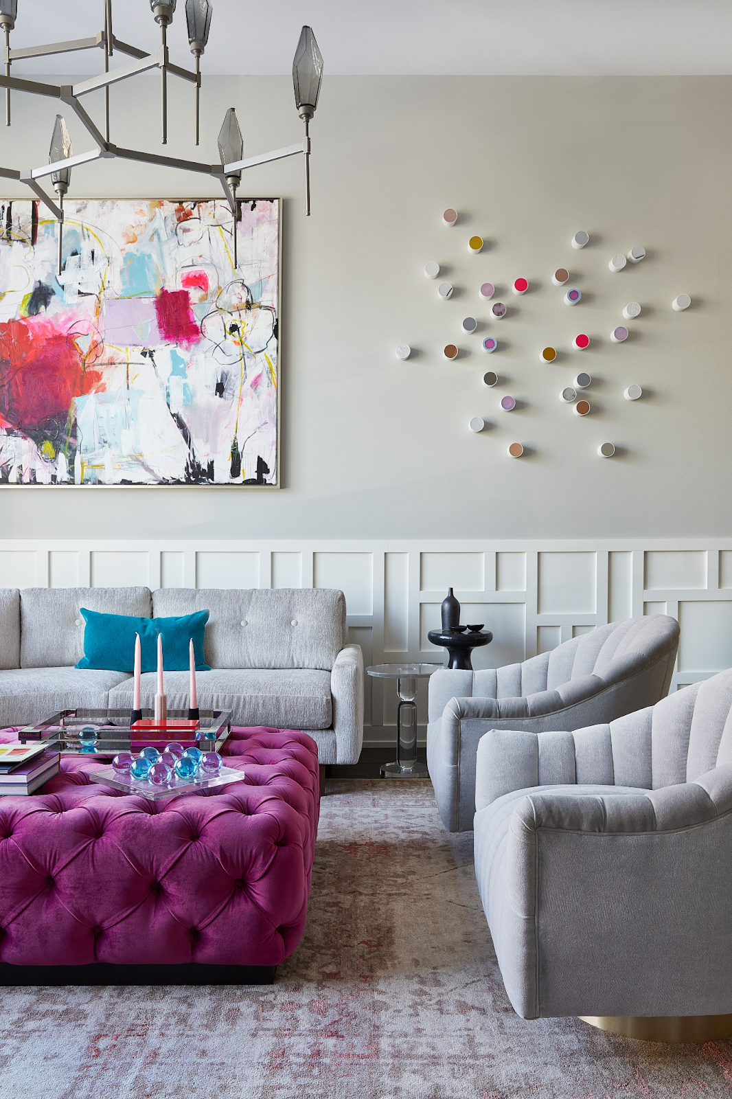 This living room balances bold artistry with modern comfort, featuring a magenta tufted ottoman, neutral seating, and vibrant wall decor.