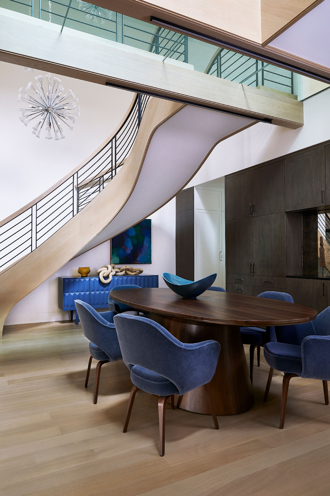 This dining space combines elegant architectural curves with rich textures, anchored by the eye-catching deep blue console that draws the viewer’s attention.