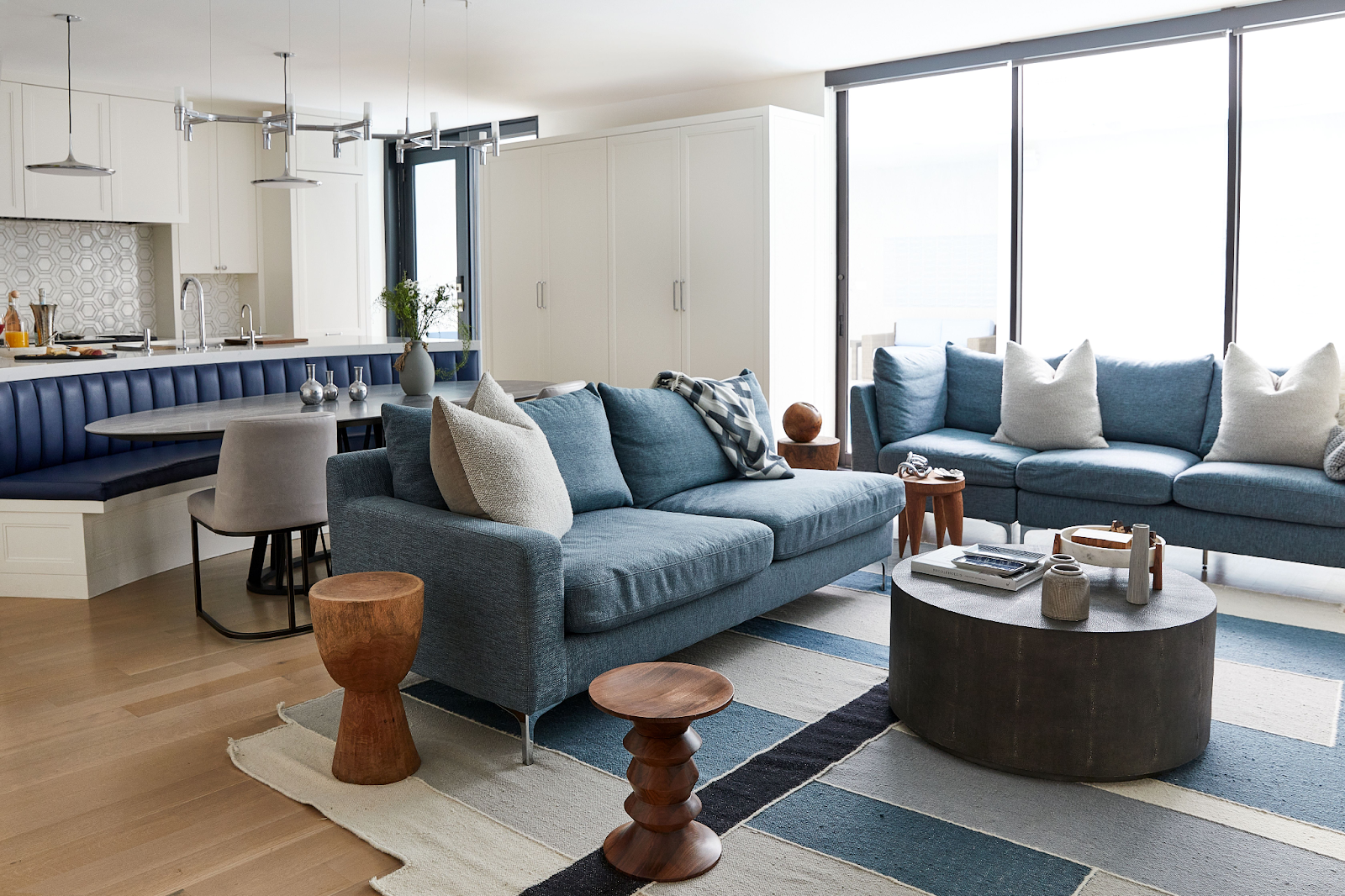 This open-concept space achieves a cohesive look with a calming blue and neutral palette, while distinct areas for lounging, dining, and cooking are cleverly defined by the arrangement of furniture.