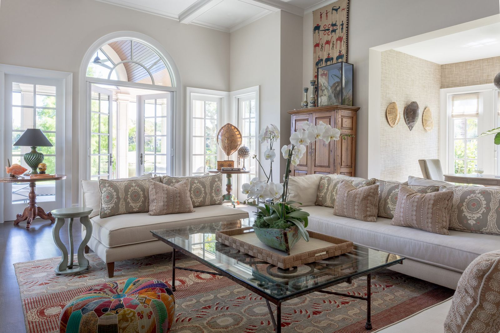 A collected and worldly traditional space layered with global textiles, rich wood tones and natural light that spills across every curated detail.