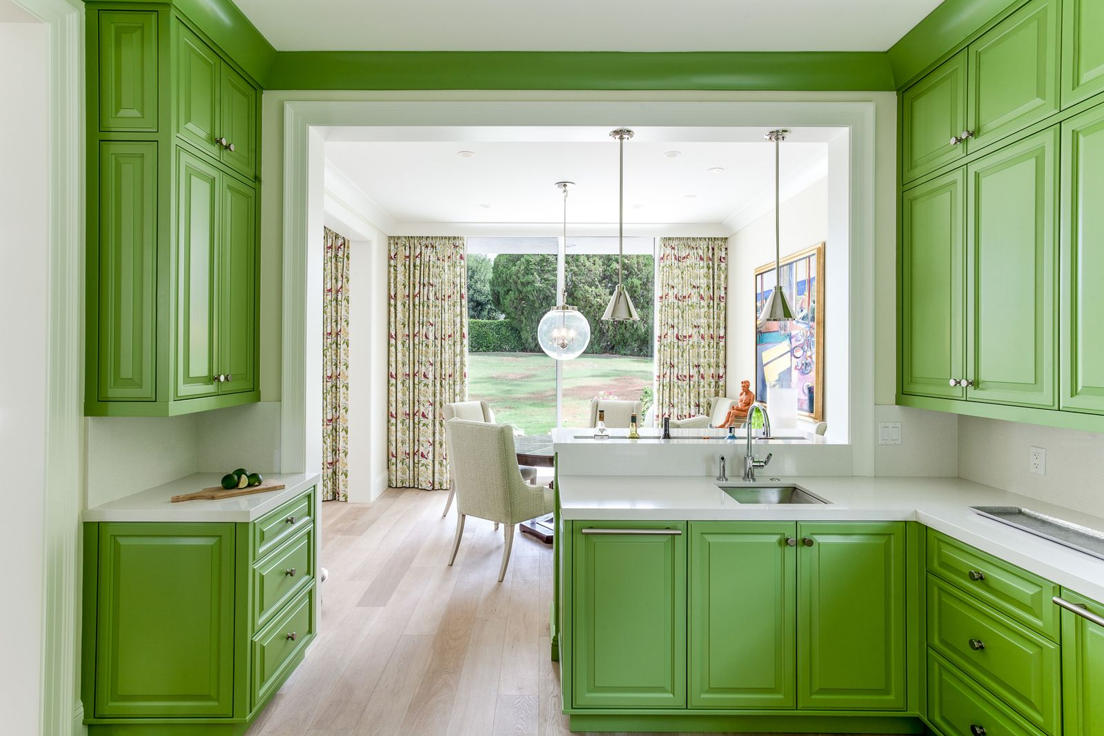 A vibrant, feel-good kitchen where bold green cabinetry brings playful energy and frames the view straight through to a sun-soaked dining nook.