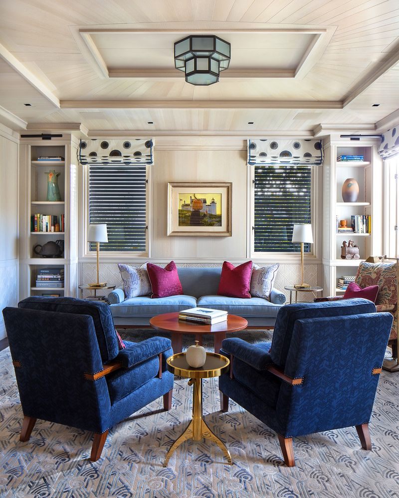 A richly layered sitting room where deep navy textures, tailored millwork and graphic roman shades come together in a space designed for conversation and quiet confidence.