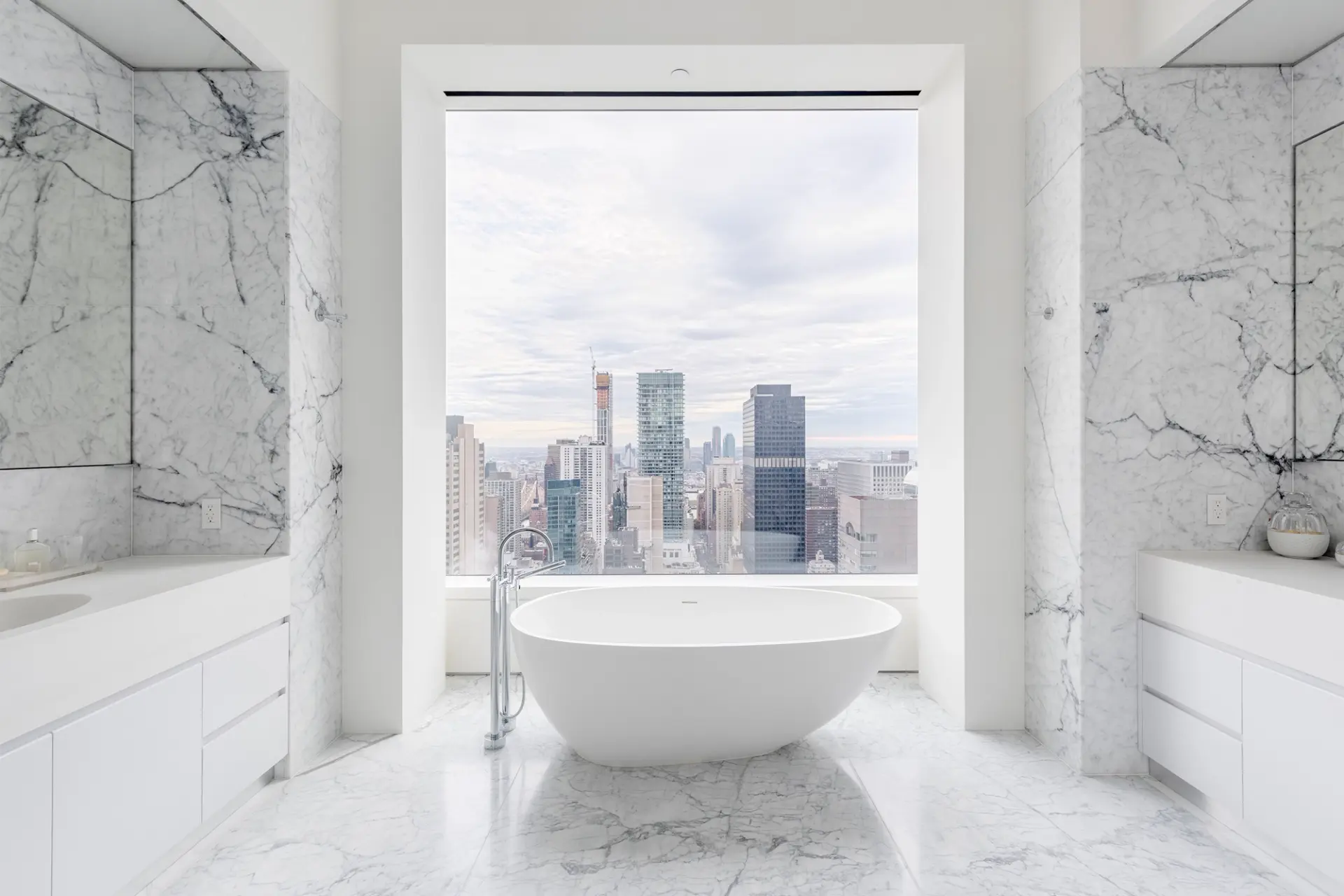 Bathing in luxury amidst the clouds, this opulent white marble bathroom transports you to serenity as you soak in the bathtub, gazing out upon the breathtaking skyline of New York City.