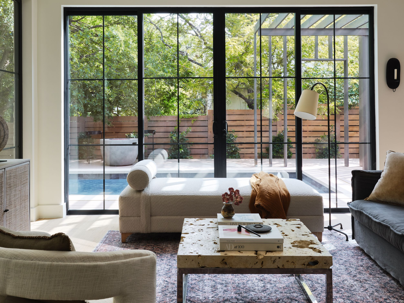 This living room perfectly balances indoor and outdoor living with expansive glass doors, inviting natural light to highlight the comfortable, modern furnishings and cozy textures.