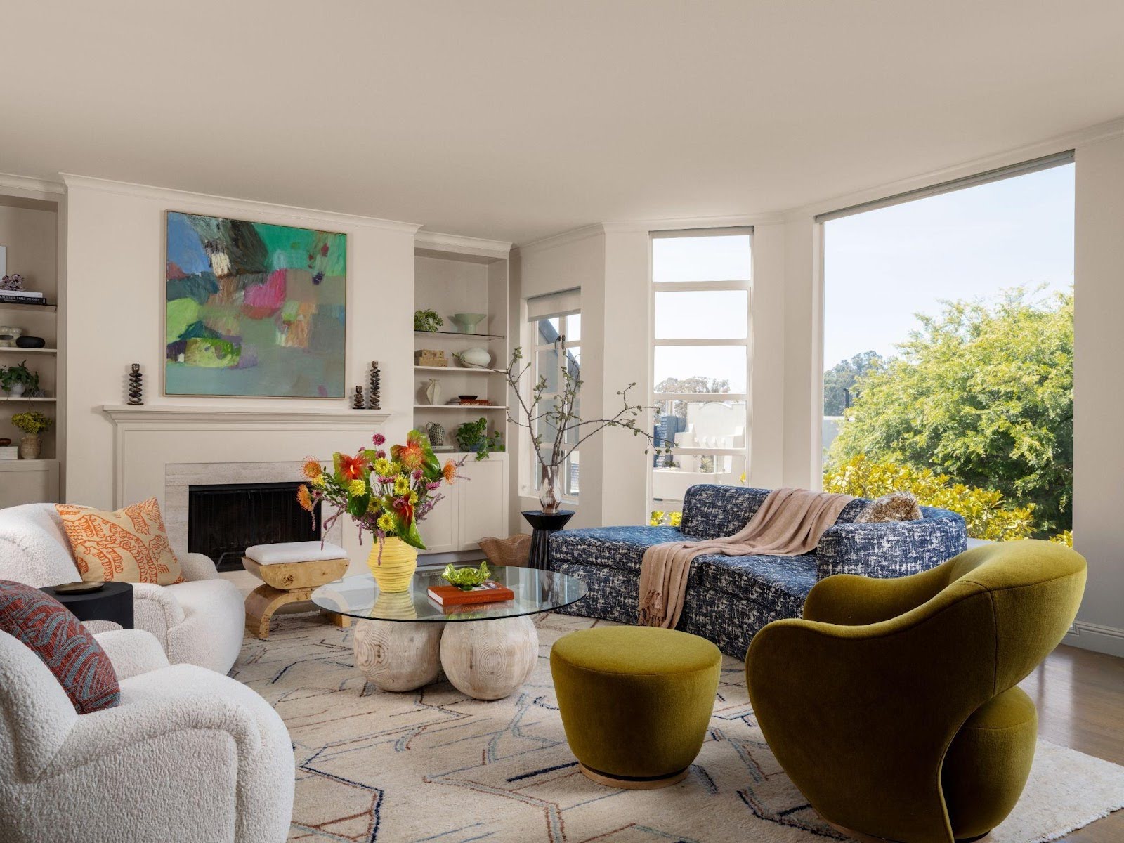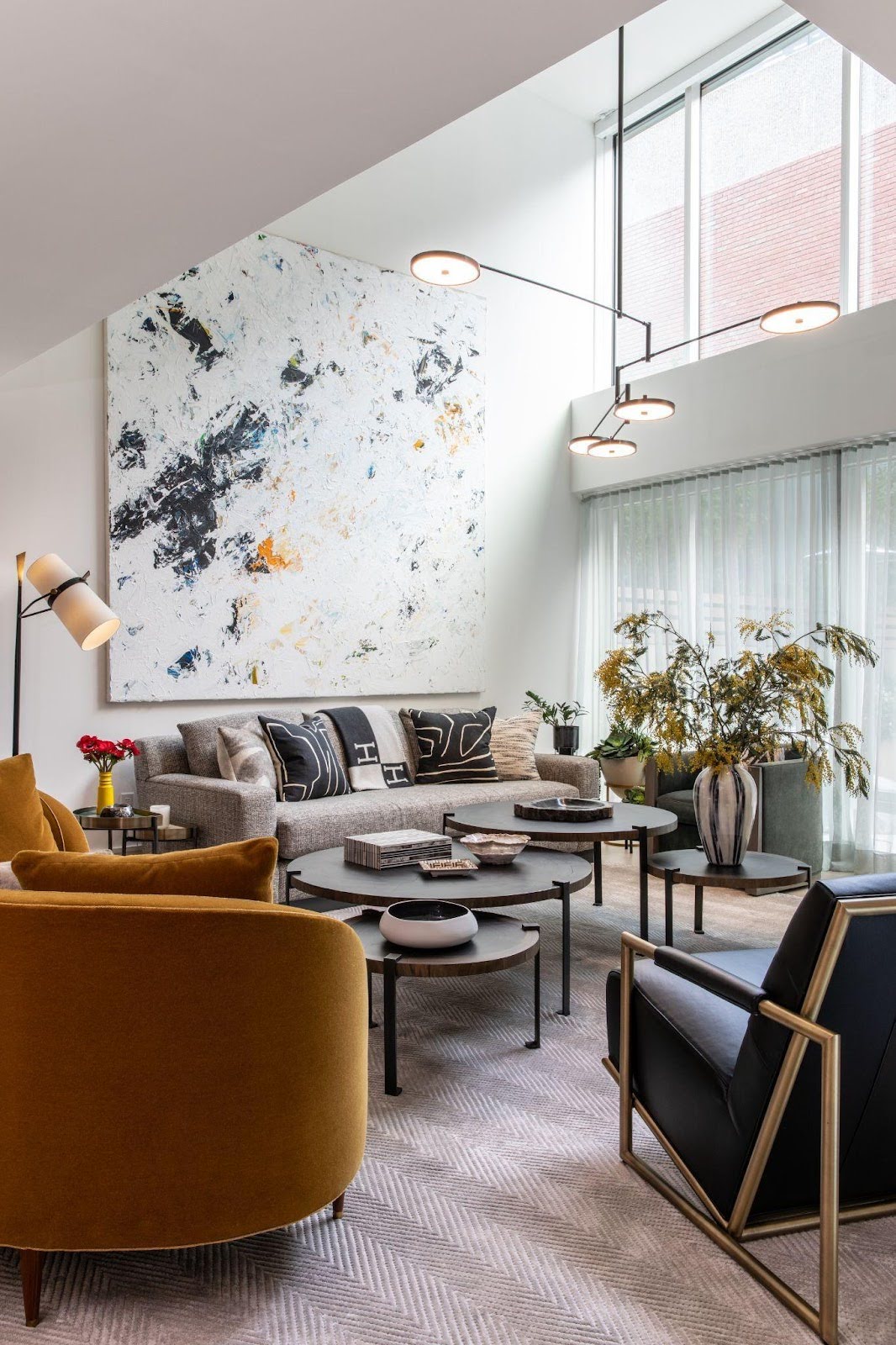 Bathed in natural light, the gestural abstract painting becomes the room’s anchor, its motion mirrored in the layered tables and curated seating.