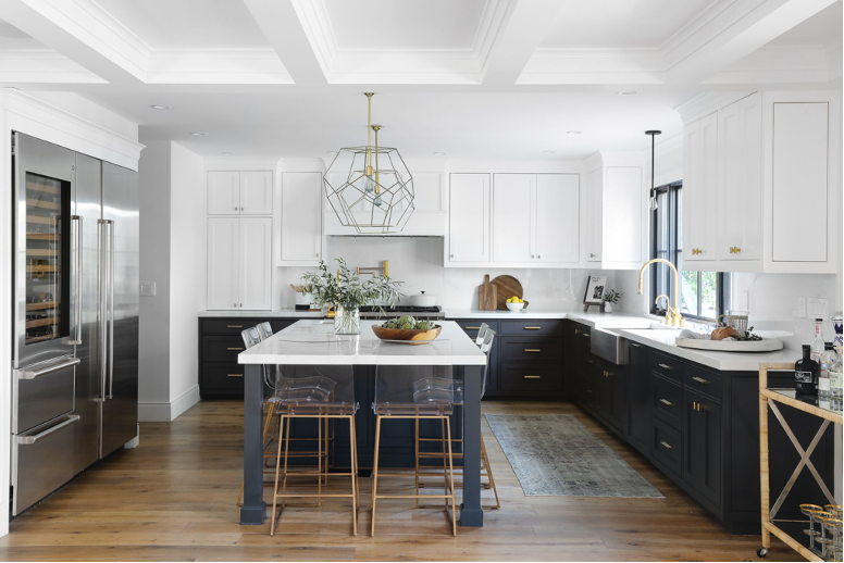 Sleek gray drawers and table legs anchor the airy white countertops and cabinetry in this kitchen. Adding to the airiness are glass pendant lights and transparent chairs.