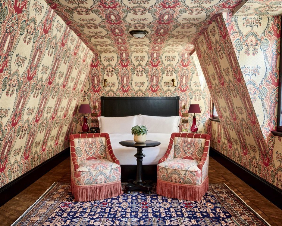 “La Valette” wallpaper by Maison Pierre Frey covers virtually every surface in this bedroom, creating a cohesive and elegant overall look.