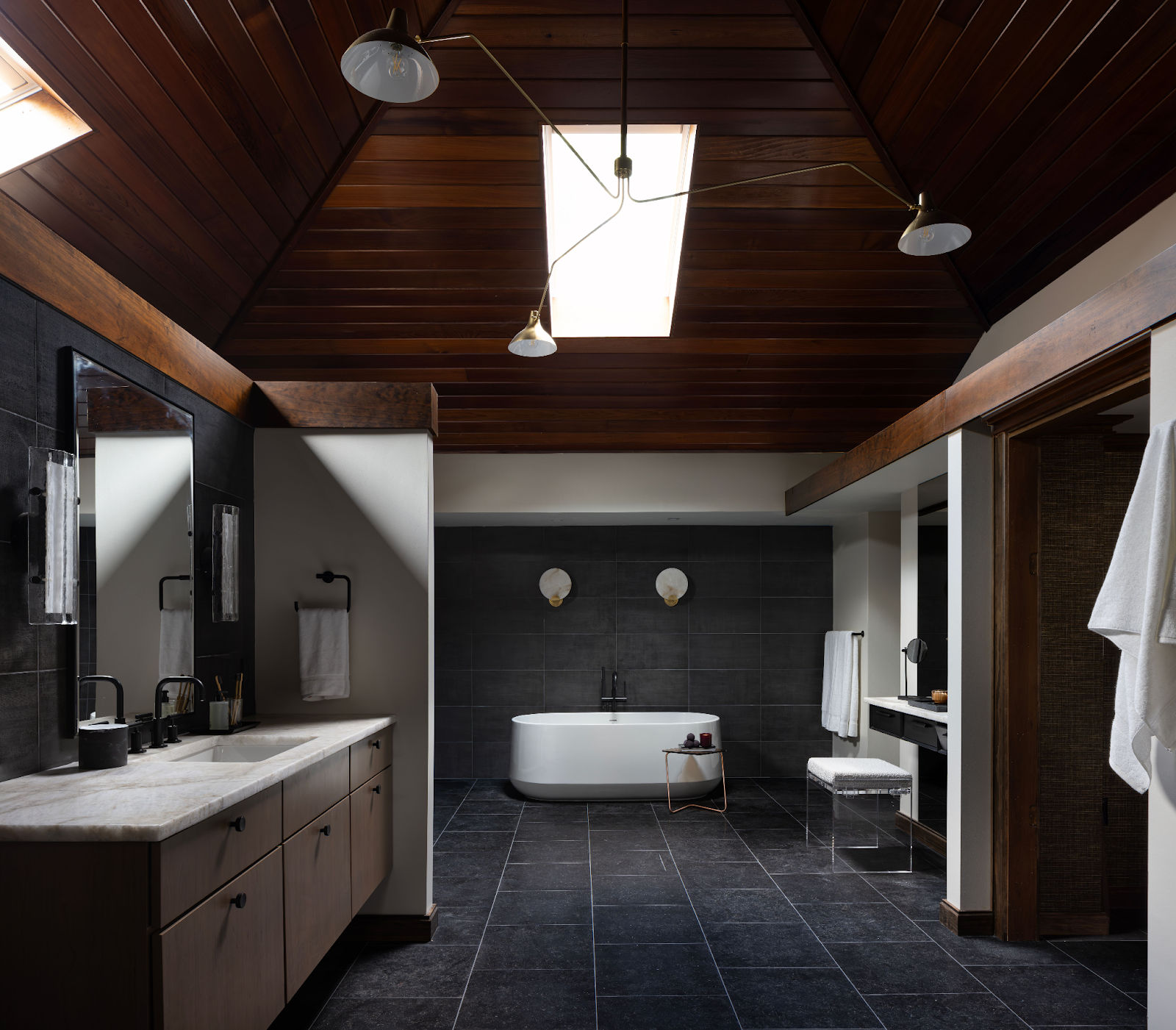 This vaulted bath embraces contrast, where the richness of wood and charcoal tile meets crisp silhouettes and soft, ambient light.
