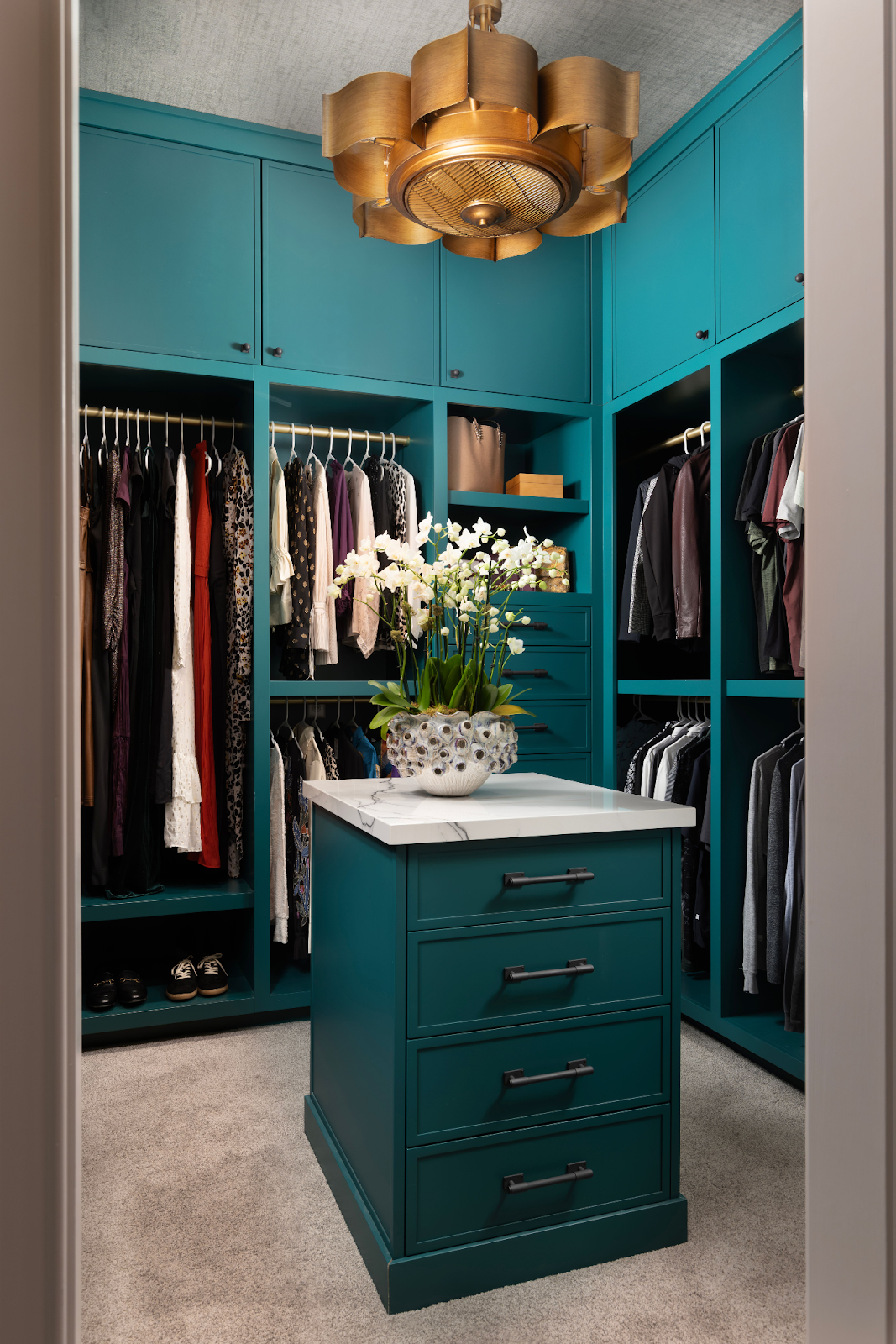 This jewel-box closet proves that storage can be a statement, with bold teal cabinetry, a sculptural gold fixture,and luxe details that make getting dressed feel like a daily indulgence.