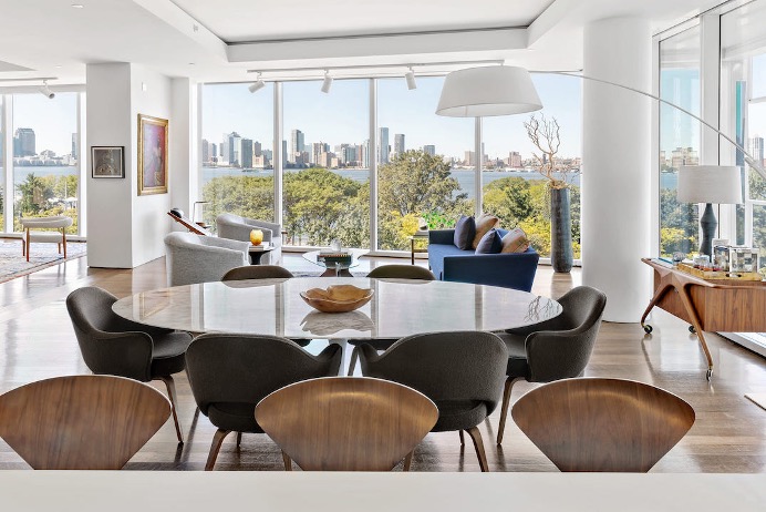 Discover the perfect blend of modern minimalism and natural warmth in this stunning West Village, NY space, featuring earthy tones, sleek wooden furnishings, and organic curves that add a touch of nature to your urban oasis.