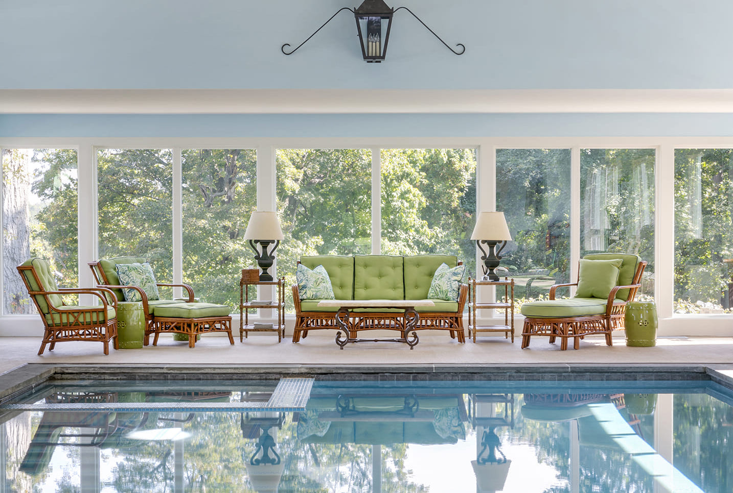 Escape to this luxurious pool house, where the soothing seafoam green and bamboo wicker lounge set adds a touch of coastal chic to the elegantly designed recreation space.
