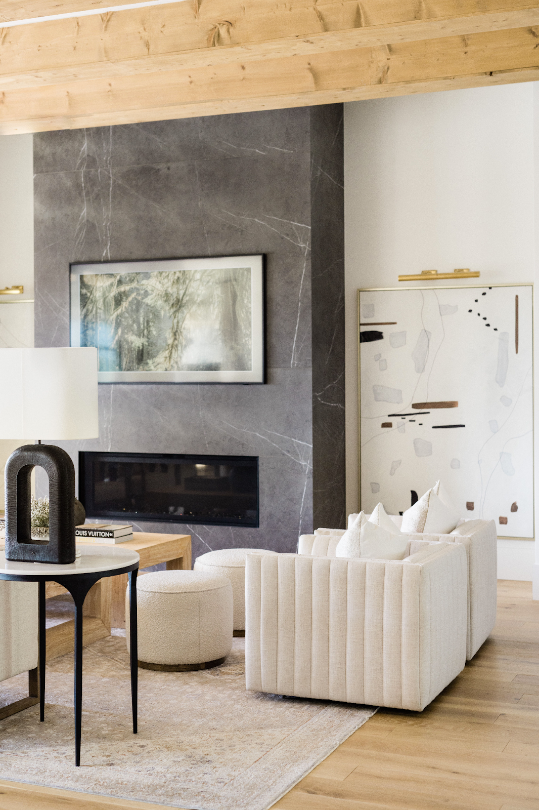This inviting space artfully plays with textures, from the smooth, cool marble embracing the fireplace to the warm, rustic wooden beams overhead, all balanced by the plush softness of the cream upholstery and the subtle weave of the area rug. Photo by Molly Culver