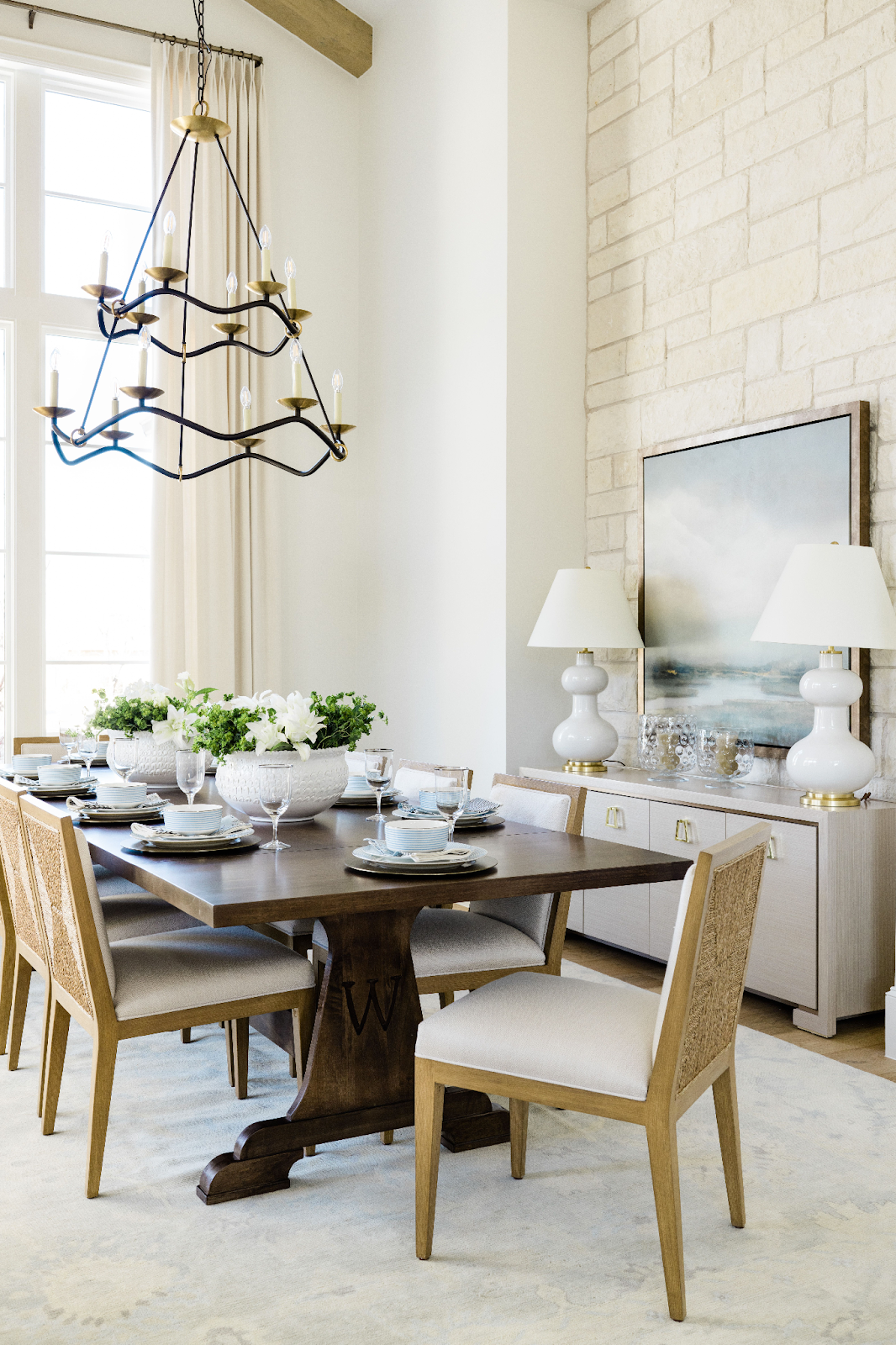 Under the warm glow of a two-tiered chandelier, this dining room pairs a robust wooden table with soft chairs, a rug, and a sideboard in serene, neutral hues. Photo by Madeline Harper