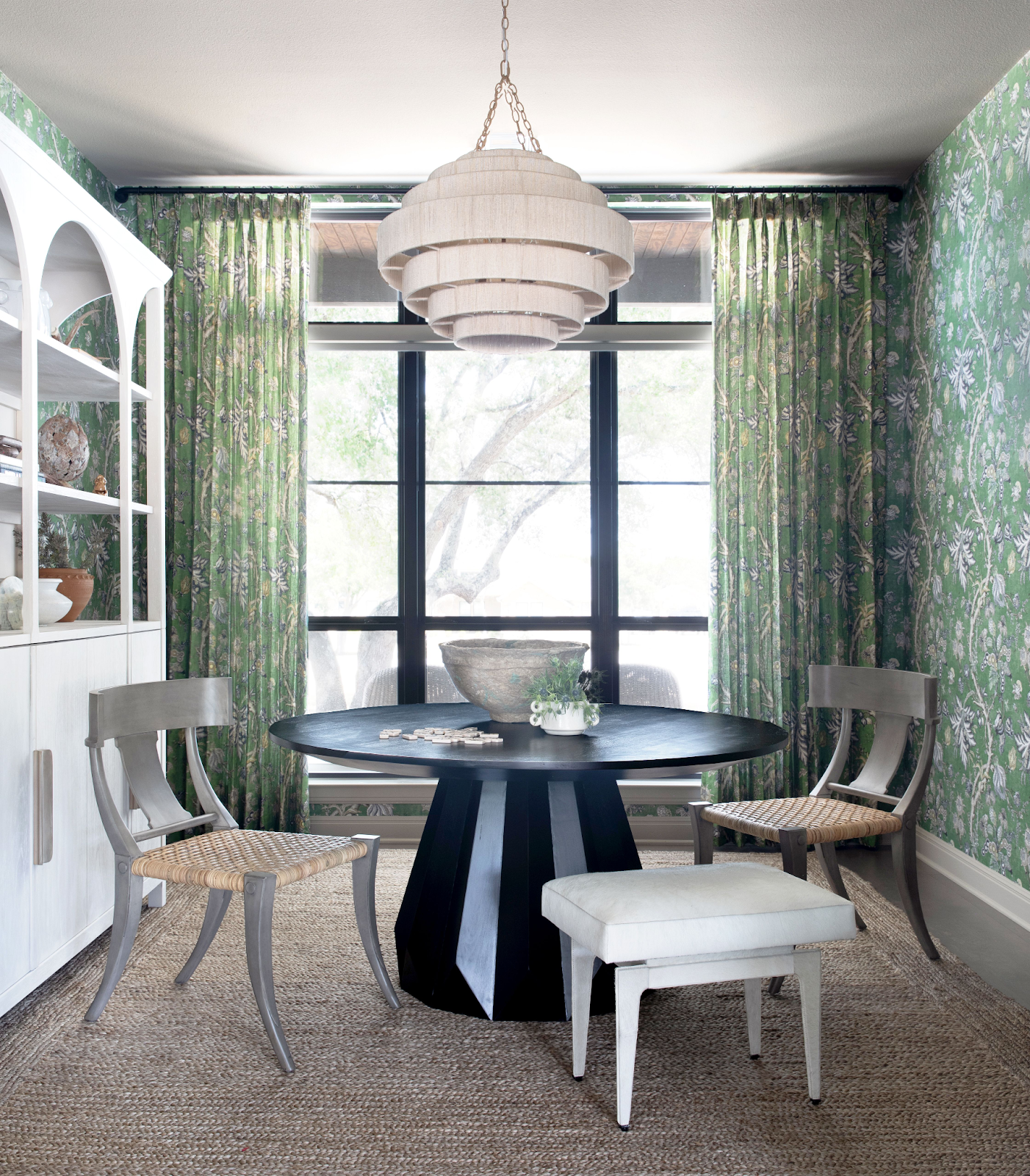 Sunlight streams through floor-to-ceiling windows, illuminating a space where a bold black table and a crisp white china cabinet stand against a backdrop of fresh flowers, capturing the essence of spring. Photo by Molly Culver