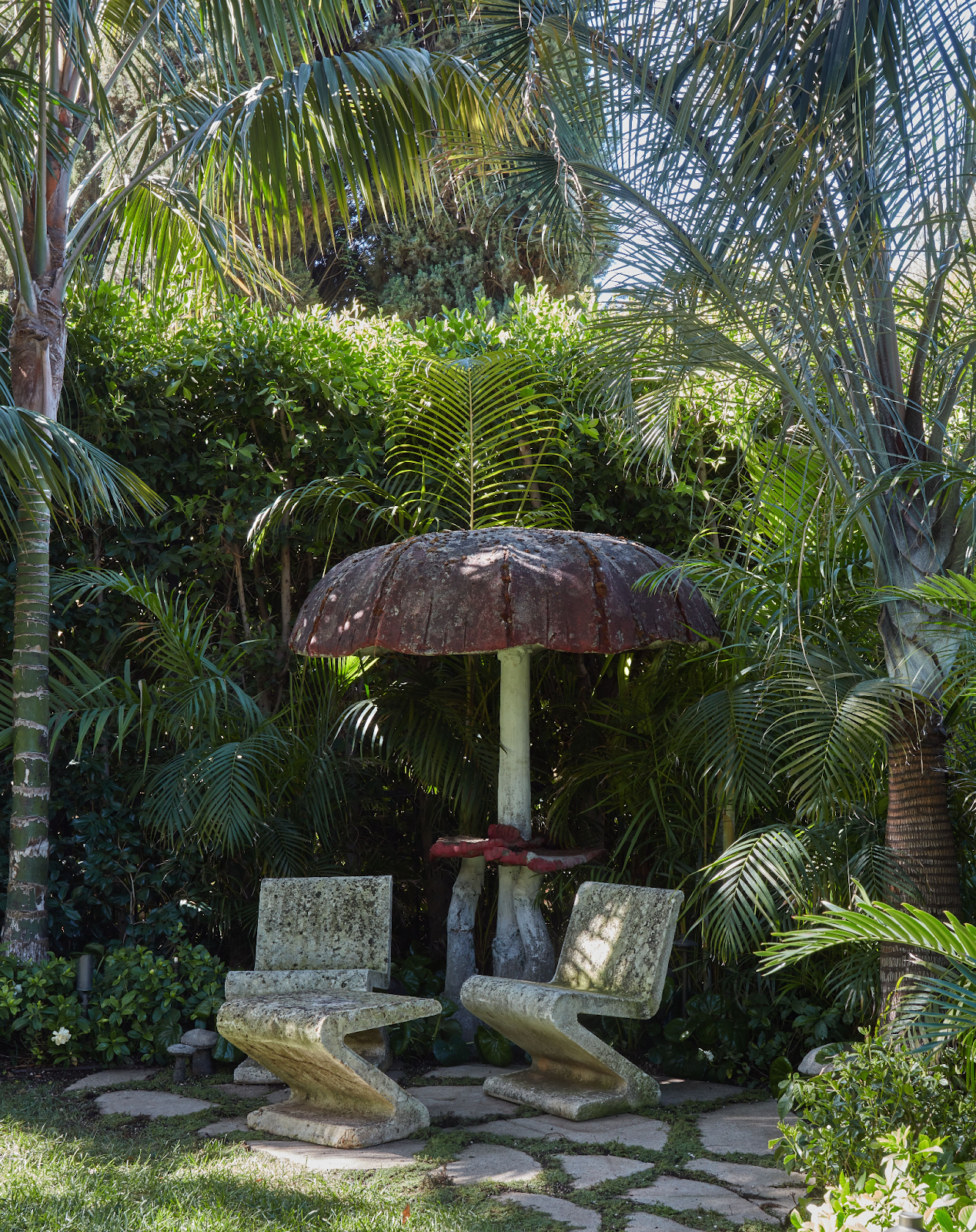 This playful, tucked-away corner uses sculptural seating and whimsical accents to create a shaded escape beneath lush palms.