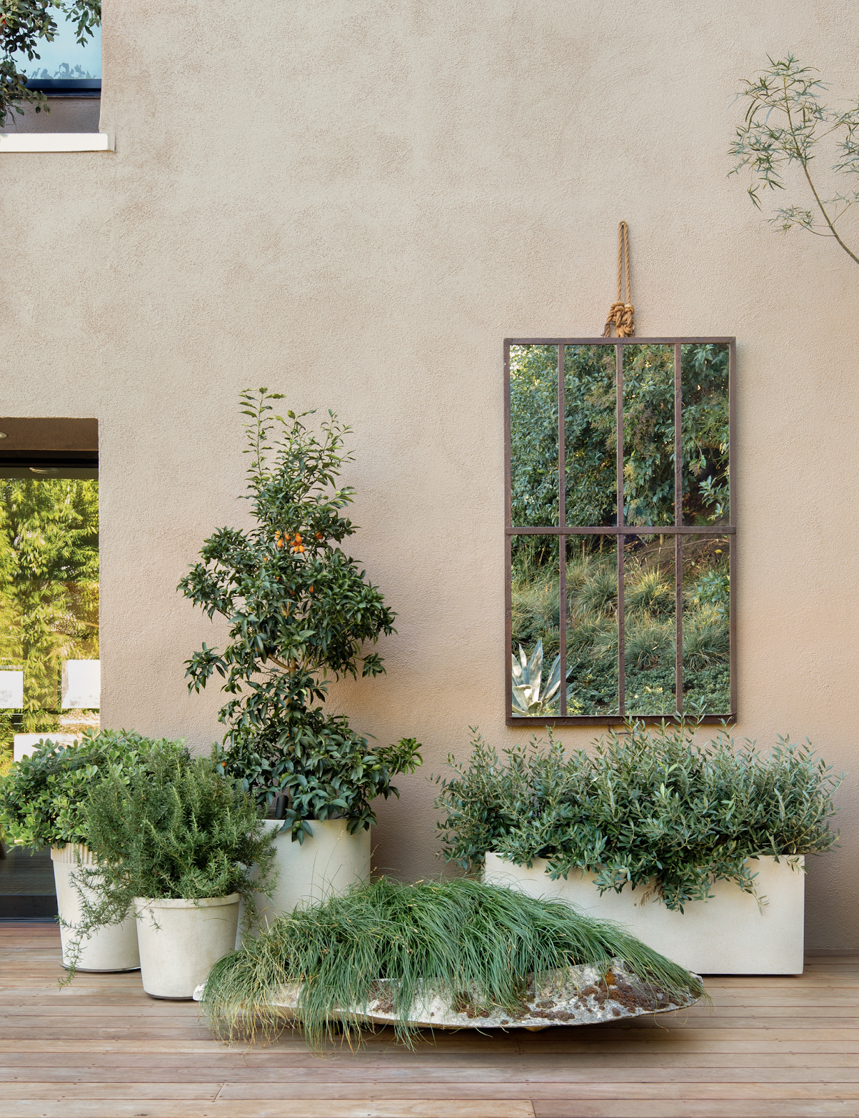 This thoughtfully arranged grouping of planters and a reflective mirror elegantly fills the empty wall space, creating visual depth and texture.