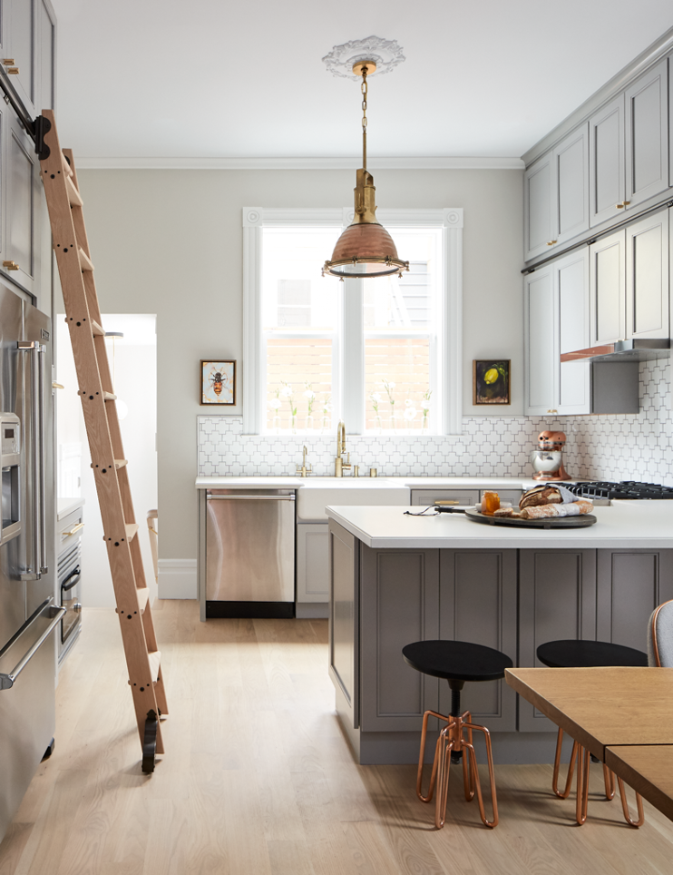 Welcome to a San Francisco kitchen boasting modern elegance. A geometric tile backsplash, brass accents and a sleek sliding ladder define this captivating culinary haven.
