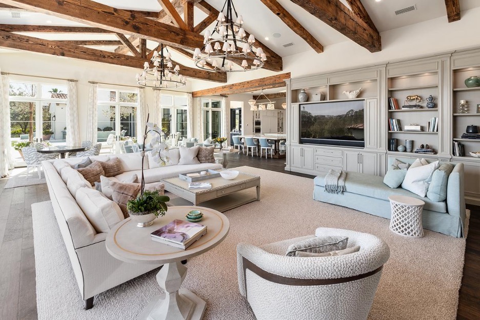 This Modern Farmhouse-style living space is perfect for entertaining. Drenched in natural light and showcasing exposed beams, this room becomes larger-than-life. A neutral color palette is adopted to let the architecture of the room truly sing.