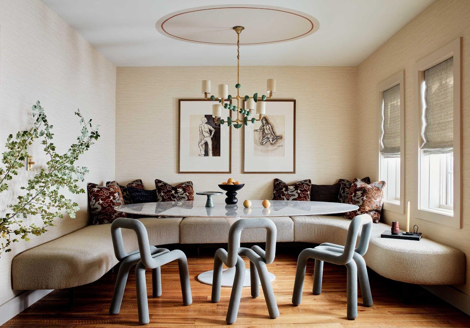 With sculptural chairs and a slim pedestal table, the full curve of the banquette flows uninterrupted, echoed by the movement of the chandelier and greenery. Photographed by Malissa Mabey