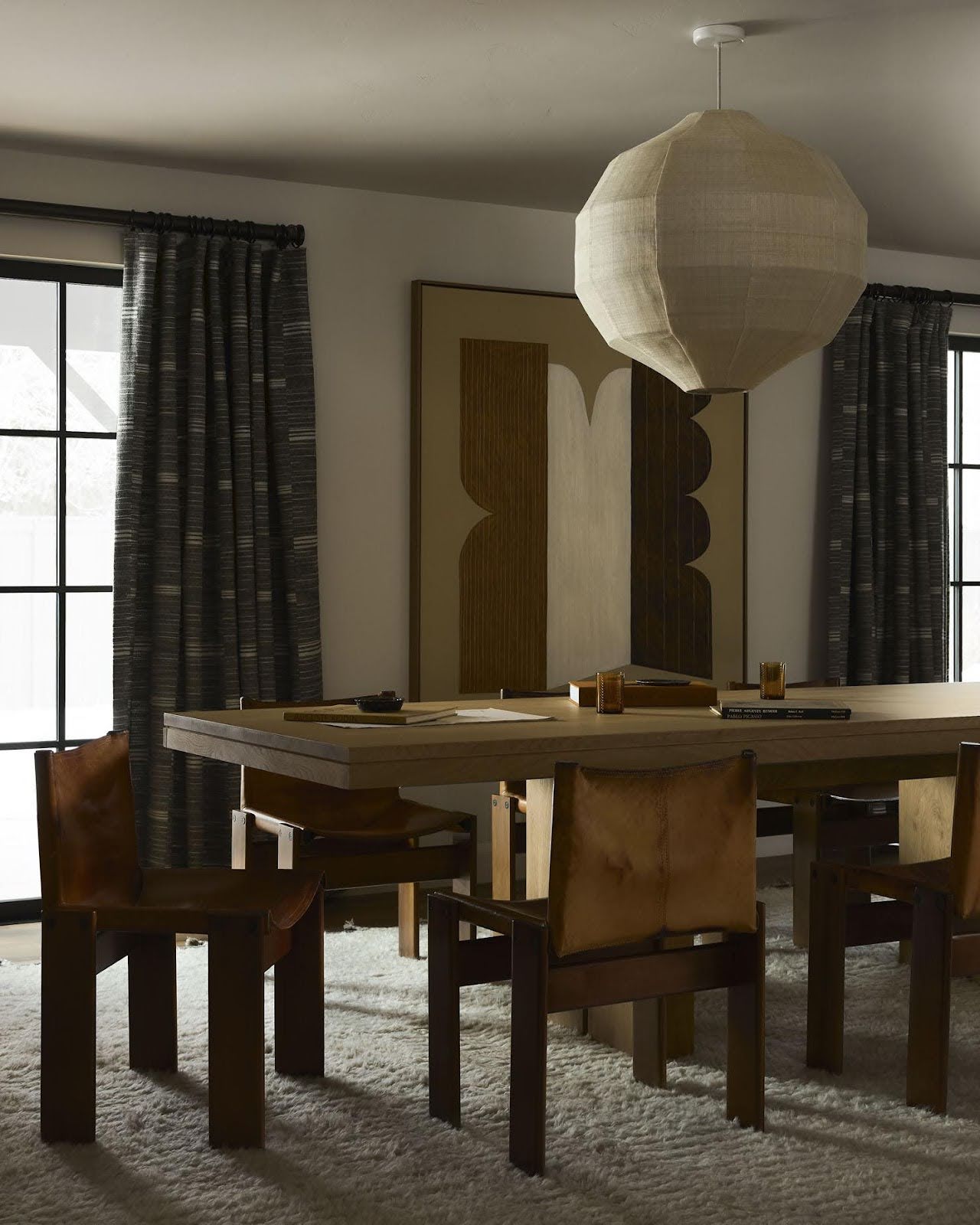 Leather chairs with a timeworn patina meet a shaggy wool rug and smooth oak, all stitched together by artwork that turns texture into geometry. Photographed by Malissa Mabey