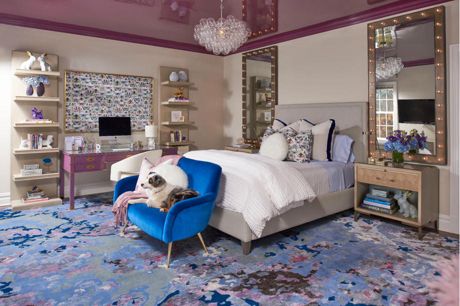 A glam girl’s bedroom dazzles with a lacquered purple ceiling and a glass bubble chandelier.