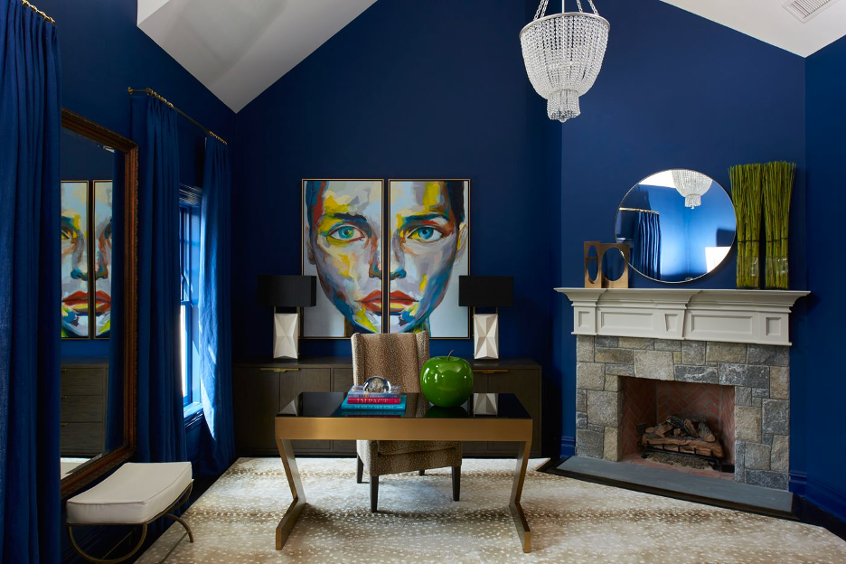 In this home office, Samuel Kane’s “Neon Portrait” diptych set against rich, cobalt blue walls, paired with the Lilian August Yves writing desk, creates an ideal space for focusing.