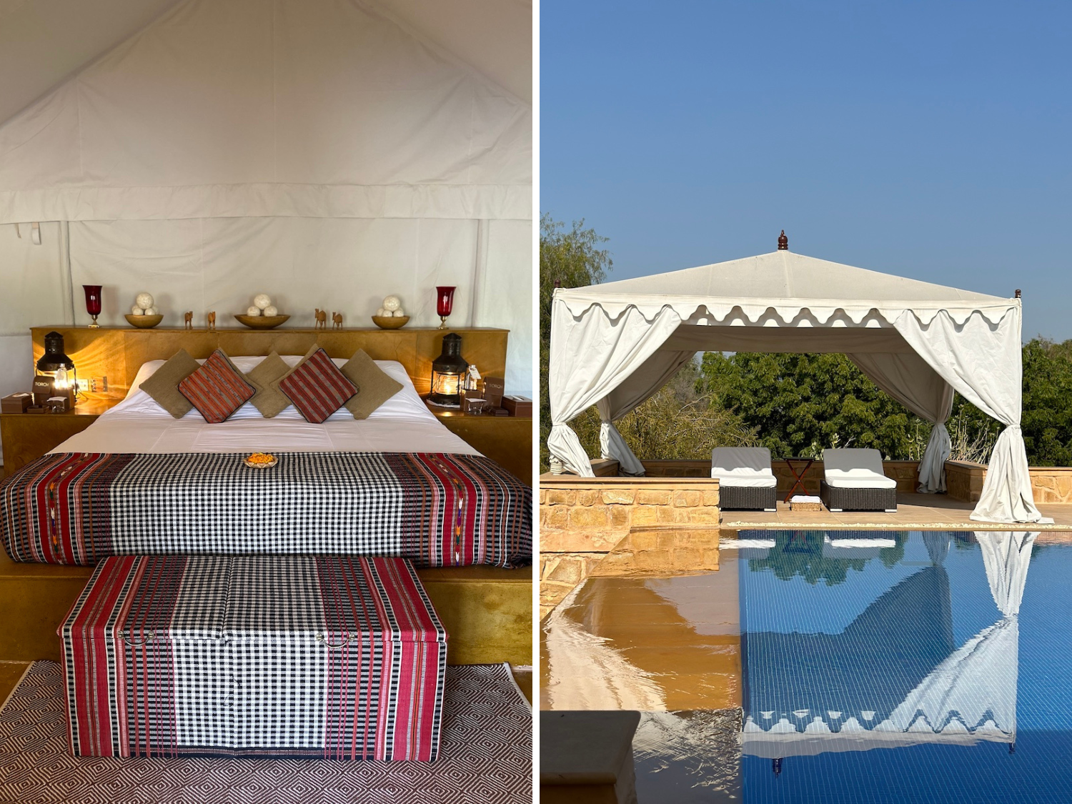 We stayed at Sujan Luxury Camp Serai, an incredible luxury camp and spa in the Thar Desert that epitomizes elegance and luxury. It draws inspiration from the caravanserais of yore and its 21 tents are a medley of styles, each one beautifully furnished with en-suite luxurious bathrooms. There is a lovely infinity pool and beautiful outdoor dining options.