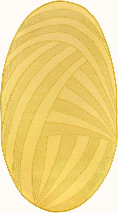 An oval rug that forms a textural cocoon, Chrysalis pays tribute to the rich cultural heritage of the ancient Silk Road, with layers of mohair, linen, twisted wool, and alpaca merino wool.