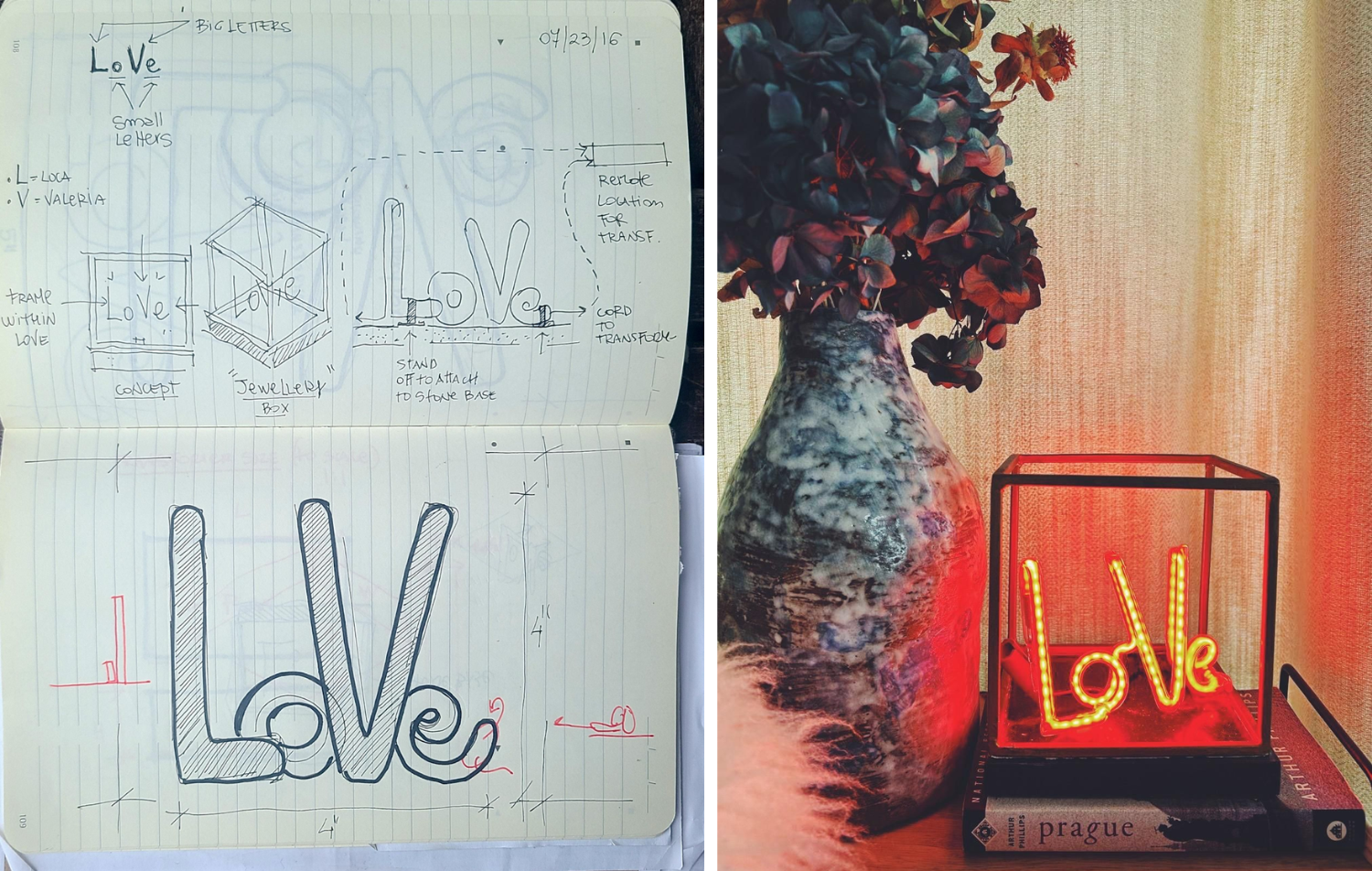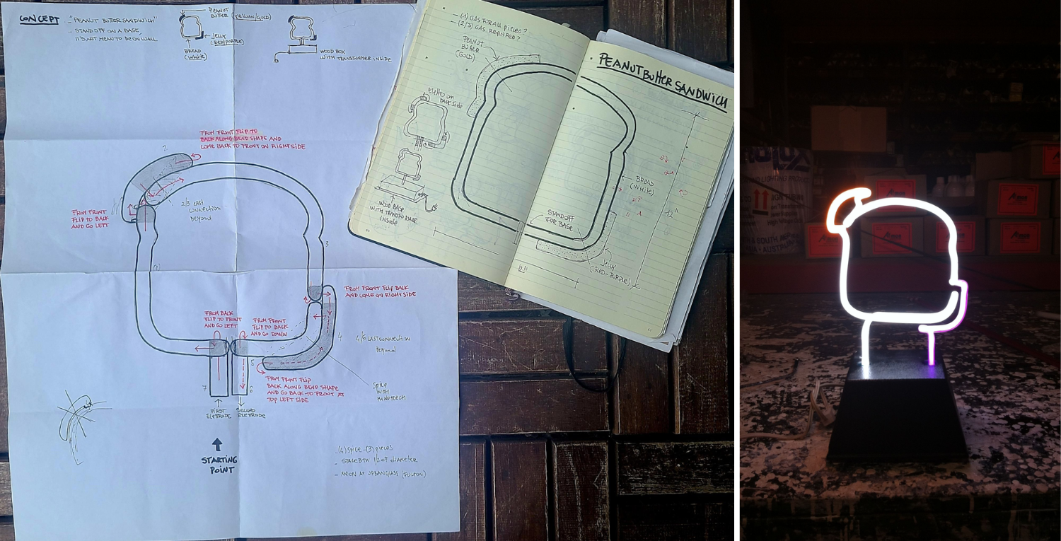 VD: My favorite part of the creative process is the rush of ideas that flows after that initial spark of inspiration. I enjoy broadening the vision, exploring possibilities, and then distilling it to the essential elements that matter most. I capture the concept and its variations in my black Moleskine notebook, and seeing the completed neon piece compared to the original sketch is always incredibly rewarding.