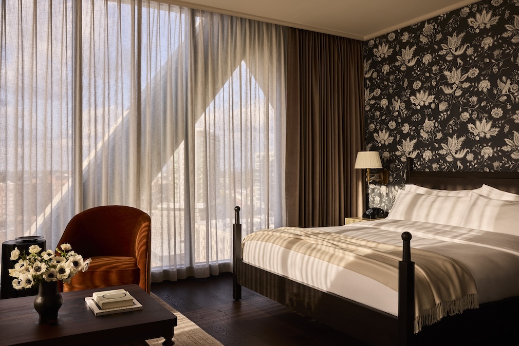 The property’s rich and tailored interiors provide a warm and welcoming counterpoint to its modern tower. Inspired by classic European and Americana design traditions reinterpreted through a contemporary lens, handmade wood furnishings, layered fabrics, and curated objects imbue each space with a sense of place and craftsmanship.